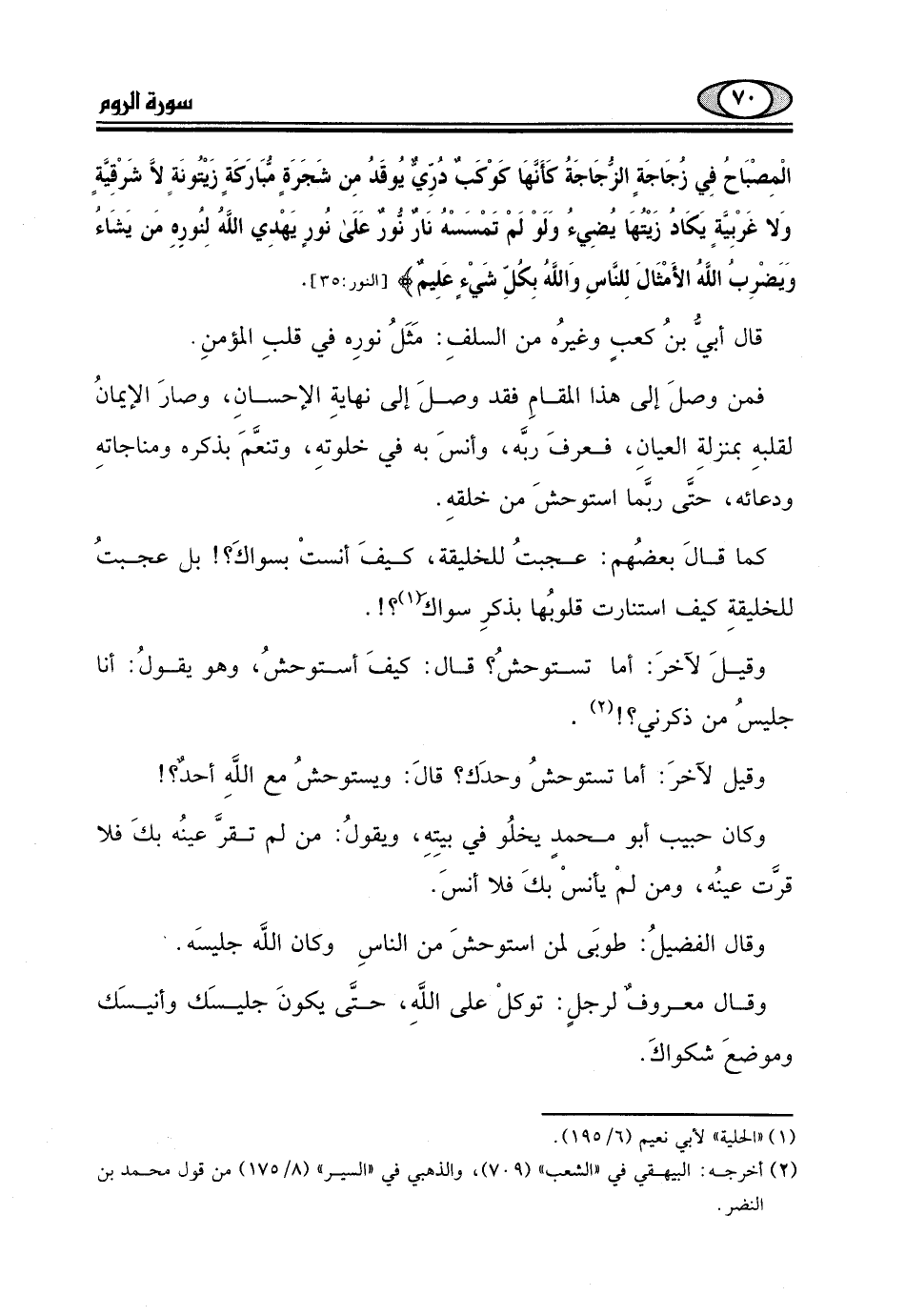 اللَّهُ نُورُ السَّمَاوَاتِ وَالْأَرْضِ مَثَلُ نُورِهِ كَمِشْكَاةٍ فِيهَا مِصْبَاحٌ الْمِصْبَاحُ فِي زُجَاجَةٍ الزُّجَاجَةُ كَأَنَّهَا كَوْكَبٌ دُرِّيٌّ يُوقَدُ مِنْ شَجَرَةٍ مُبَارَكَةٍ زَيْتُونَةٍ لَا شَرْقِيَّةٍ وَلَا غَرْبِيَّةٍ يَكَادُ زَيْتُهَا يُضِيءُ وَلَوْ لَمْ تَمْسَسْهُ نَارٌ نُورٌ عَلَى نُورٍ يَهْدِي اللَّهُ لِنُورِهِ مَنْ يَشَاءُ وَيَضْرِبُ اللَّهُ الْأَمْثَالَ لِلنَّاسِ وَاللَّهُ بِكُلِّ شَيْءٍ عَلِيمٌ (35) .