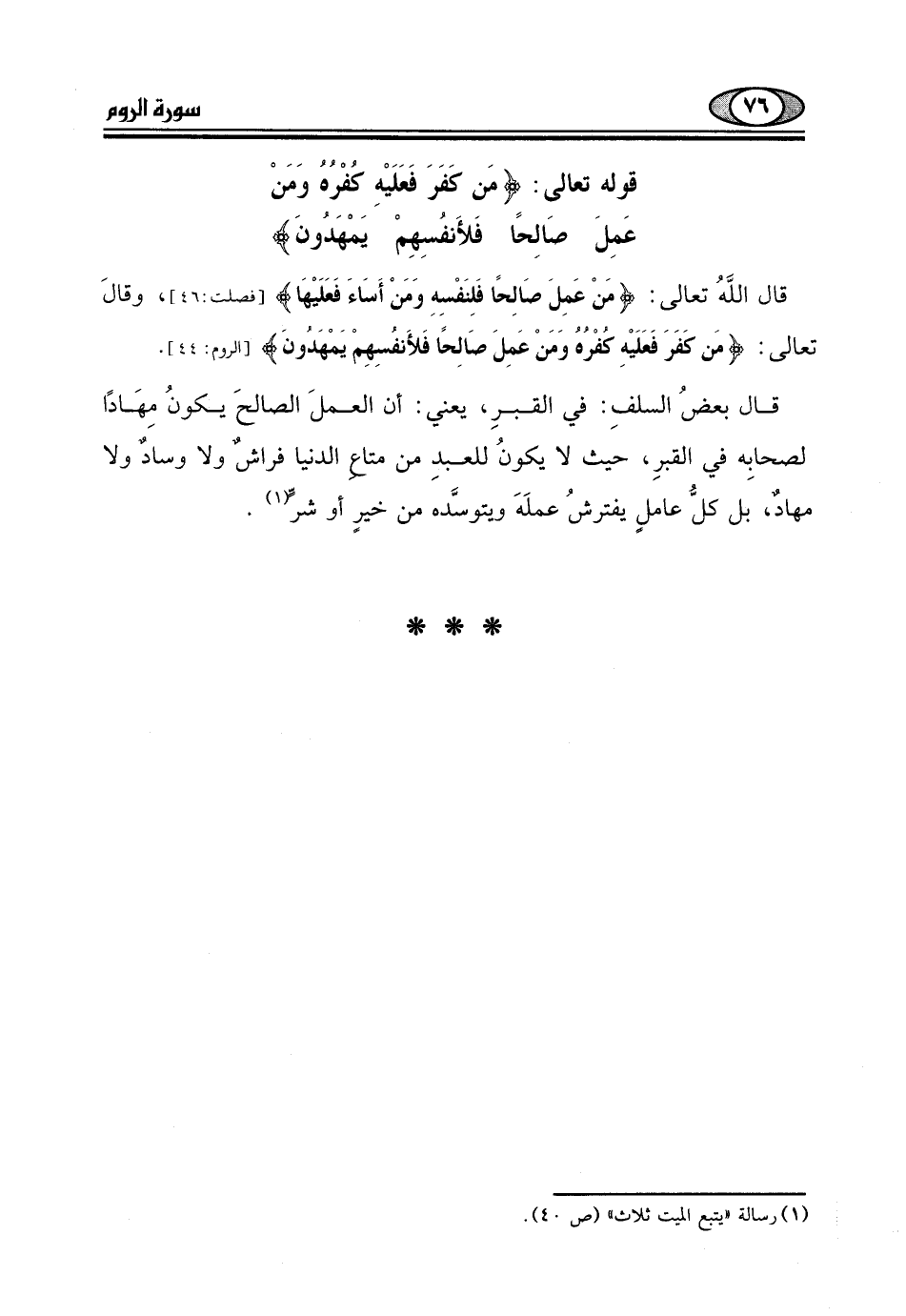 وقالَ تعالى: (مَنْ كَفَرَ فَعَلَيْهِ كُفْرُهُ وَمَنْ عَمِلَ صَالِحًا فَلِأَنْفُسِهِمْ يَمْهَدُونَ) .