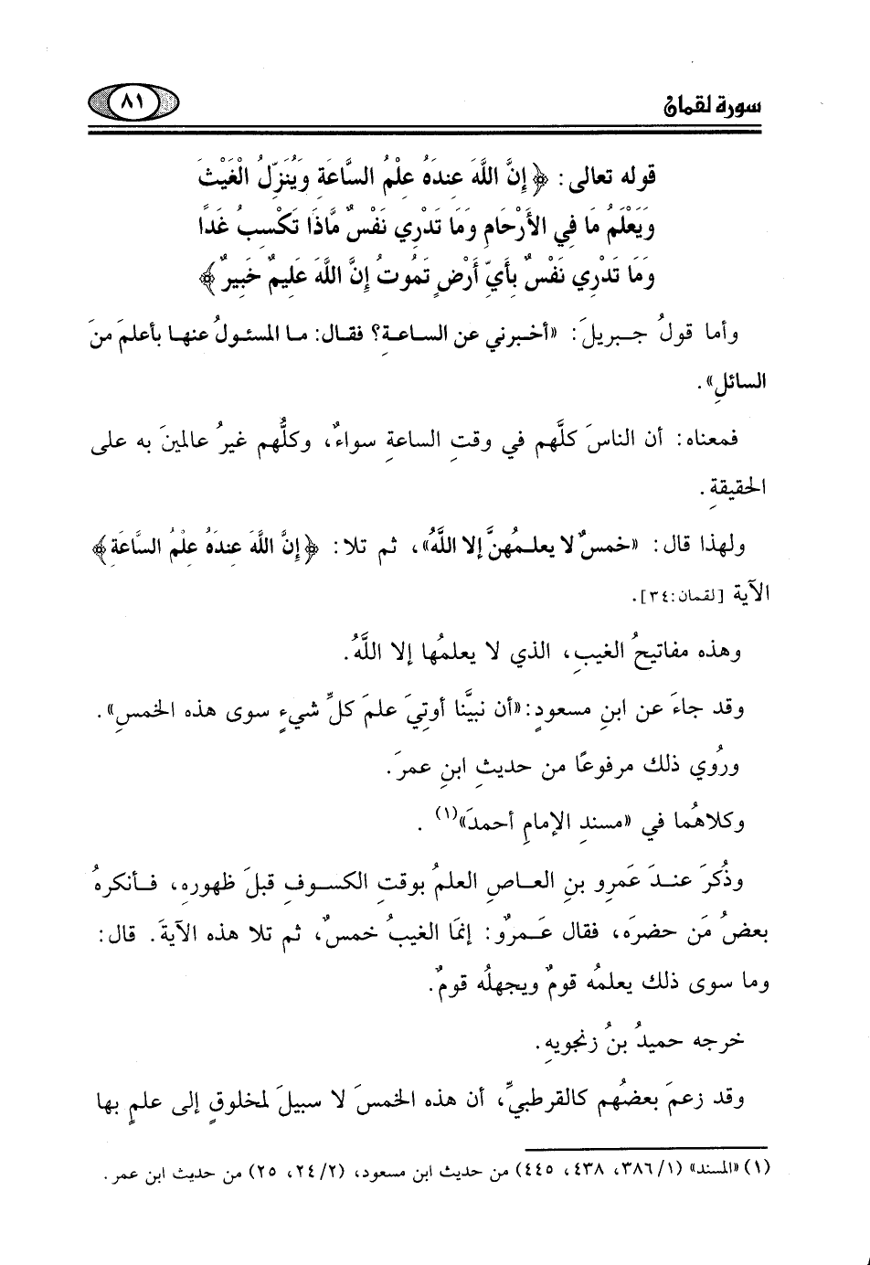 ولهذا قال: "خمسٌ لا يعلمُهنَّ إلا اللَهُ "، ثم تلا: (إِنَّ اللَّهَ عِنْدَهُ عِلْمُ السَّاعَةِ)
