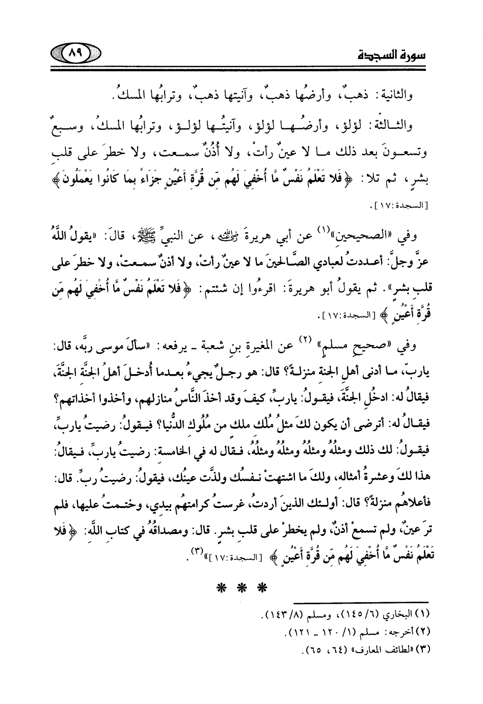 بشرٍ، ثم تلا: (فَلَا تَعْلَمُ نَفْسٌ مَا أُخْفِيَ لَهُمْ مِنْ قُرَّةِ أَعْيُنٍ جَزَاءً بِمَا كَانُوا يَعْمَلُونَ (17) .