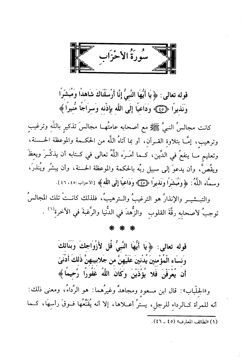 قوله تعالى: (يَا أَيُّهَا النَّبِيُّ إِنَّا أَرْسَلْنَاكَ شَاهِدًا وَمُبَشِّرًا وَنَذِيرًا (45) وَدَاعِيًا إِلَى اللَّهِ بِإِذْنِهِ وَسِرَاجًا مُنِيرًا (46)