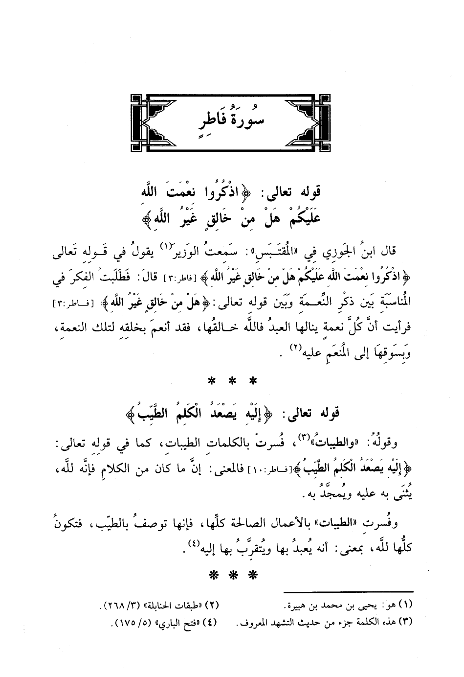(هَلْ مِنْ خَالِقٍ غَيْرُ اللَّهِ) ، فرأيت أنَّ كُلَّ نعمة ينالها العبدُ فاللًّه خالقُها، فقد أنعمَ بخلقه لتلك النعمة، وَبِسَوقِهَا إلى المُنعَم عليه. ً
