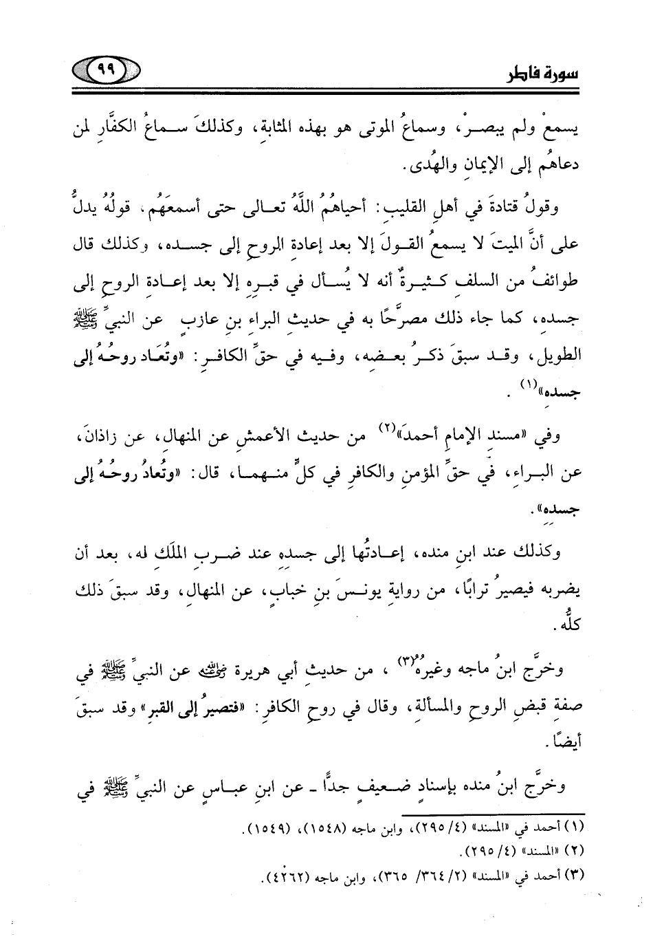 وقولُ قتادةَ في أهلِ القليبِ: أحياهُمُ اللَّهُ تعالى حتى أسمعَهُم.