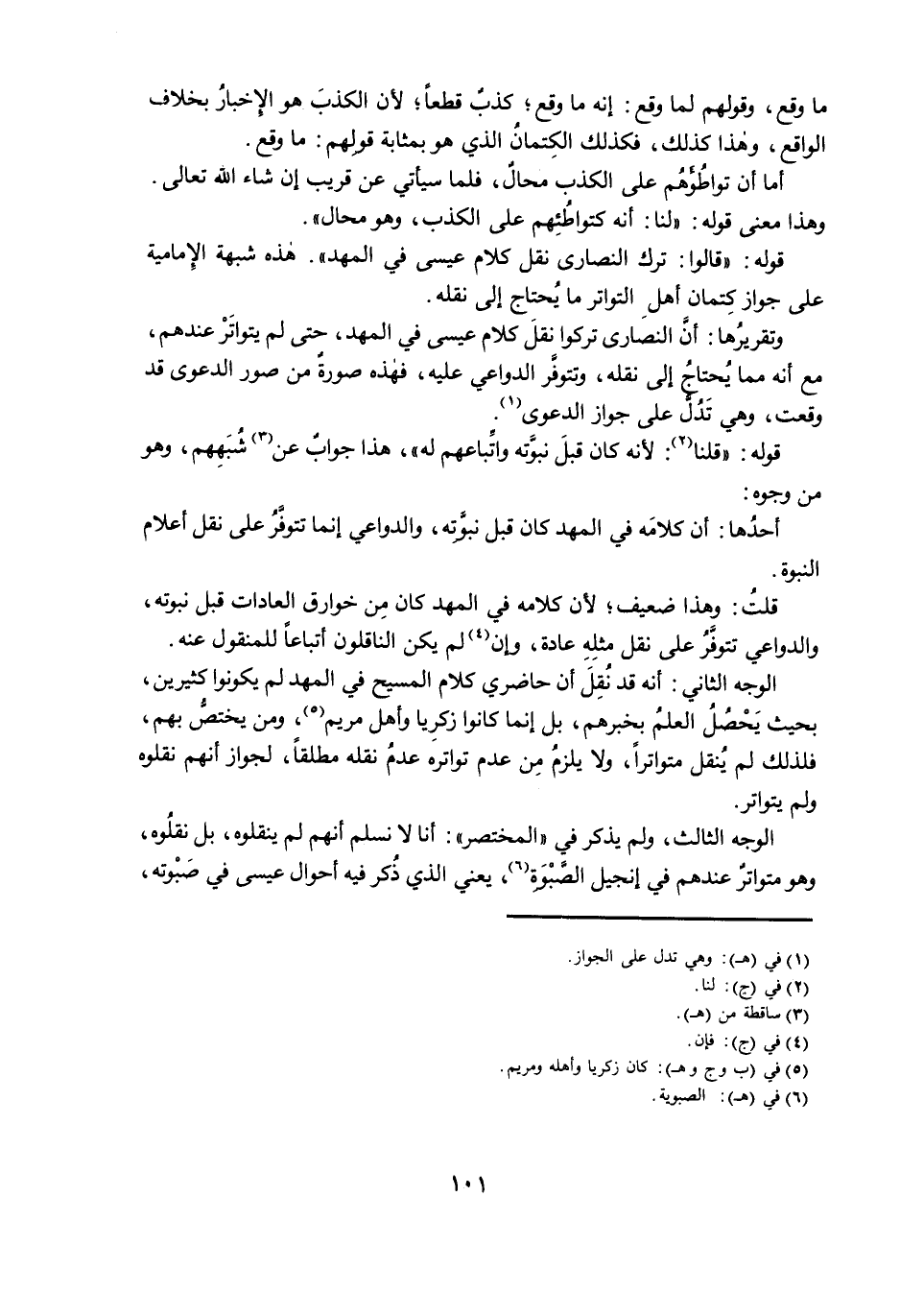 قَوْلُهُ: «قَالُوا: تَرْكُ النَّصَارَى نَقَلَ كَلَامِ عِيسَى فِي الْمَهْدِ» . هَذِهِ شُبْهَةُ الْإِمَامِيَّةِ عَلَى جَوَازِ كِتْمَانِ أَهْلِ التَّوَاتُرِ مَا يُحْتَاجُ إِلَى نَقْلِهِ.