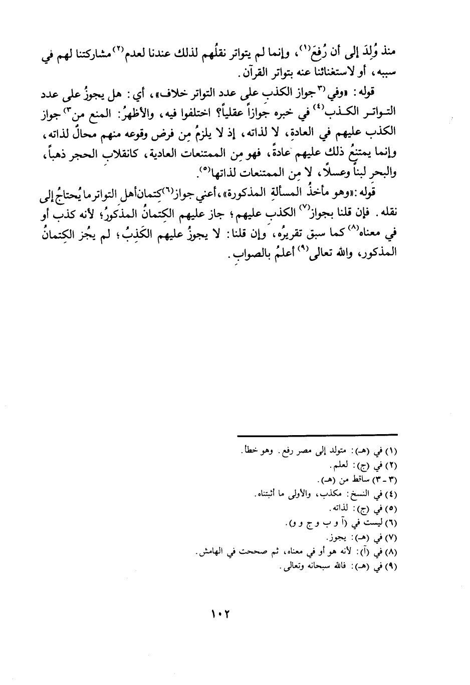 قَوْلُهُ: «وَفِي جَوَازِ الْكَذِبِ عَلَى عَدَدِ التَّوَاتُرِ خِلَافٌ» ، أَيْ: هَلْ يَجُوزُ عَلَى عَدَدِ التَّوَاتُرِ الْكَذِبُ فِي خَبَرِهِ جَوَازًا عَقْلِيًّا؟ اخْتَلَفُوا فِيهِ، وَالْأَظْهَرُ: الْمَنْعُ مِنْ جَوَازِ الْكَذِبِ عَلَيْهِمْ فِي الْعَادَةِ، لَا لِذَاتِهِ، إِذْ لَا يَلْزَمُ مِنْ فَرْضِ وُقُوعِهِ مِنْهُمْ مُحَالٌ لِذَاتِهِ، وَإِنَّمَا يَمْتَنِعُ ذَلِكَ عَلَيْهِمْ عَادَةً ; فَهُوَ مِنَ الْمُمْتَنِعَاتِ الْعَادِيَّةِ، كَانْقِلَابِ الْحَجَرِ ذَهَبًا، وَالْبَحْرِ لَبَنًا وَعَسَلًا، لَا مِنَ الْمُمْتَنِعَاتِ لِذَاتِهَا.