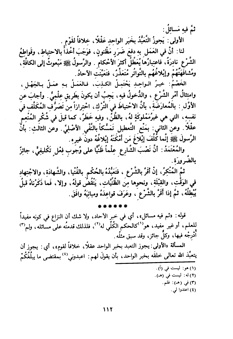 الْمَسْأَلَةُ «الْأُولَى: يَجُوزُ التَّعَبُّدُ بِخَبَرِ الْوَاحِدِ عَقْلًا، خِلَافًا لِقَوْمٍ» ، أَيْ: يَجُوزُ أَنْ يَتَعَبَّدَ اللَّهُ تَعَالَى خَلْقَهُ بِخَبَرِ الْوَاحِدِ، بِأَنْ يَقُولَ لَهُمُ: اعْبُدُونِي بِمُقْتَضَى مَا يَبْلُغُكُمْ