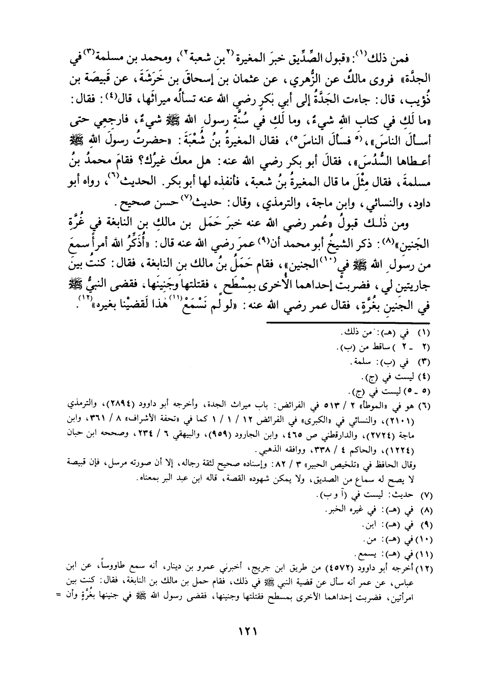 فَمِنْ ذَلِكَ: «قَبُولُ الصِّدِّيقِ خَبَرَ الْمُغِيرَةِ بْنِ شُعْبَةَ، وَمُحَمَّدِ بْنِ مَسْلَمَةَ فِي الْجَدَّةِ» ؛ فَرَوَى مَالِكٌ عَنِ الزُّهْرِيِّ، عَنْ عُثْمَانَ بْنِ إِسْحَاقَ بْنِ خَرَشَةَ، عَنْ قَبِيصَةَ بْنِ ذُؤَيْبٍ، قَالَ: جَاءَتِ الْجَدَّةُ إِلَى أَبِي بَكْرٍ رَضِيَ اللَّهُ عَنْهُ تَسْأَلُهُ مِيرَاثَهَا، قَالَ: فَقَالَ: مَا لَكِ فِي كِتَابِ اللَّهِ شَيْءٌ، وَمَا لَكِ فِي سُنَّةِ رَسُولِ اللَّهِ صَلَّى اللَّهُ عَلَيْهِ وَسَلَّمَ، شَيْءٌ؛ فَارْجِعِي حَتَّى أَسْأَلَ النَّاسَ؛ فَسَأَلَ النَّاسَ؛ فَقَالَ الْمُغِيرَةُ بْنُ شُعْبَةَ: حَضَرْتُ رَسُولَ اللَّهِ صَلَّى اللَّهُ عَلَيْهِ وَسَلَّمَ، أَعْطَاهَا السُّدُسَ؛ فَقَالَ أَبُو بَكْرٍ رَضِيَ اللَّهُ عَنْهُ: هَلْ مَعَكَ غَيْرُكَ؟ فَقَامَ مُحَمَّدُ بْنُ مَسْلَمَةَ؛ فَقَالَ مِثْلَ مَا قَالَ الْمُغِيرَةُ بْنُ شُعْبَةَ؛ فَأَنْفَذَهُ لَهَا أَبُو بَكْرٍ الْحَدِيثَ. رَوَاهُ أَبُو دَاوُدَ، وَالنَّسَائِيُّ، وَابْنُ مَاجَهْ، وَالتِّرْمِذِيُّ، وَقَالَ: حَدِيثٌ حَسَنٌ صَحِيحٌ.