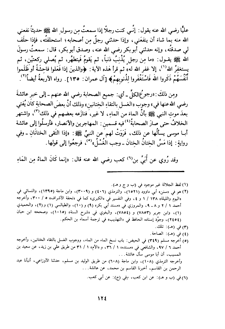 عَلِيًّا رَضِيَ اللَّهُ عَنْهُ يَقُولُ: إِنِّي كُنْتُ رَجُلًا إِذَا سَمِعْتُ مِنْ رَسُولِ اللَّهِ صَلَّى اللَّهُ عَلَيْهِ وَسَلَّمَ، حَدِيثًا نَفَعَنِي اللَّهُ مِنْهُ بِمَا شَاءَ أَنْ يَنْفَعَنِي، وَإِذَا حَدَّثَنِي رَجُلٌ مِنْ أَصْحَابِهِ، اسْتَحْلَفْتُهُ، فَإِذَا حَلَفَ لِي صَدَّقْتُهُ، وَإِنَّهُ حَدَّثَنِي أَبُو بَكْرٍ رَضِيَ اللَّهُ عَنْهُ، وَصَدَقَ أَبُو بَكْرٍ، قَالَ: سَمِعْتُ رَسُولَ اللَّهِ صَلَّى اللَّهُ عَلَيْهِ وَسَلَّمَ، يَقُولُ: مَا مِنْ رَجُلٍ يُذْنِبُ ذَنْبًا، ثُمَّ يَقُومُ فَيَتَطَهَّرُ، ثُمَّ يُصَلِّي رَكْعَتَيْنِ، ثُمَّ يَسْتَغْفِرُ اللَّهَ، إِلَّا غَفَرَ اللَّهُ لَهُ، ثُمَّ قَرَأَ هَذِهِ الْآيَةَ: {وَالَّذِينَ إِذَا فَعَلُوا فَاحِشَةً أَوْ ظَلَمُوا أَنْفُسَهُمْ ذَكَرُوا اللَّهَ فَاسْتَغْفَرُوا لِذُنُوبِهِمْ} [آلِ عِمْرَانَ: 135] . رَوَاهُ الْأَرْبَعَةُ أَيْضًا.