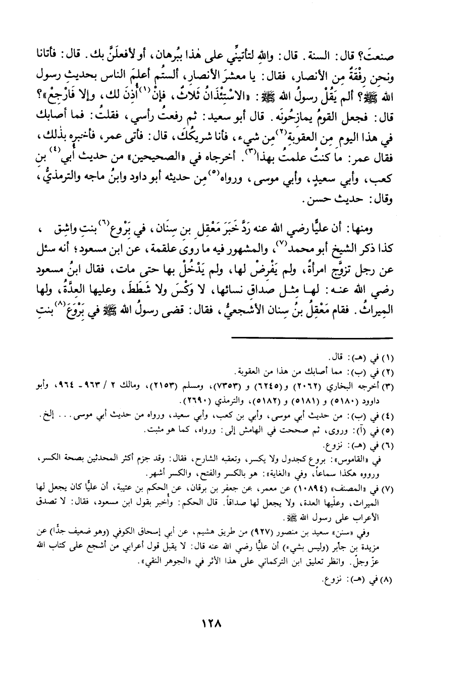 وَمِنْهَا: أَنَّ عَلِيًّا رَضِيَ اللَّهُ عَنْهُ رَدَّ خَبَرَ مَعْقِلِ بْنِ سِنَانٍ، فِي بَرْوَعَ بِنْتِ وَاشِقٍ، كَذَا ذَكَرَ الشَّيْخُ أَبُو مُحَمَّدٍ، وَالْمَشْهُورُ فِيهِ مَا رَوَى عَلْقَمَةُ، عَنِ ابْنِ مَسْعُودٍ، أَنَّهُ سُئِلَ عَنْ رَجُلٍ تَزَوَّجَ امْرَأَةً، وَلَمْ يَفْرِضْ لَهَا، وَلَمْ يَدْخُلْ بِهَا حَتَّى مَاتَ؛ فَقَالَ ابْنُ مَسْعُودٍ رَضِيَ اللَّهُ عَنْهُ: لَهَا مِثْلُ صَدَاقِ نِسَائِهَا، لَا وَكْسَ وَلَا شَطَطَ، وَعَلَيْهَا الْعِدَّةُ، وَلَهَا الْمِيرَاثُ. فَقَامَ مَعْقِلُ بْنُ سِنَانٍ الْأَشْجَعِيُّ؛ فَقَالَ: قَضَى رَسُولُ اللَّهِ صَلَّى اللَّهُ عَلَيْهِ وَسَلَّمَ، فِي بَرْوَعَ بِنْتِ