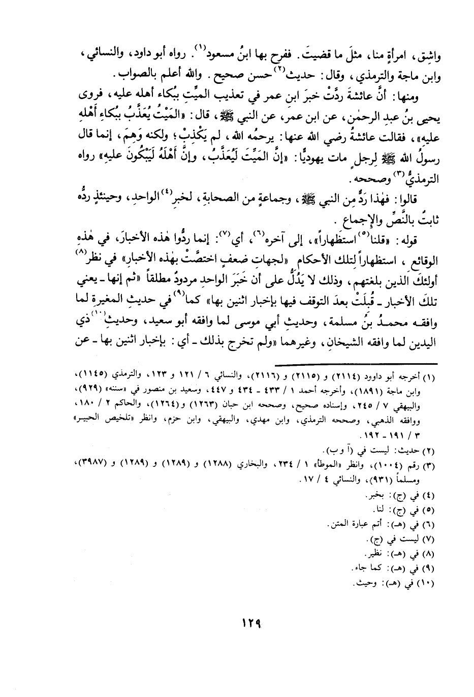 وَمِنْهَا: أَنَّ عَائِشَةَ رَدَّتْ خَبَرَ ابْنِ عُمَرَ فِي تَعْذِيبِ الْمَيِّتِ بِبُكَاءِ أَهْلِهِ عَلَيْهِ؛ فَرَوَى يَحْيَى بْنُ عَبْدِ الرَّحْمَنِ، عَنِ ابْنِ عُمَرَ، عَنِ النَّبِيِّ صَلَّى اللَّهُ عَلَيْهِ وَسَلَّمَ، قَالَ: الْمَيِّتُ يُعَذَّبُ بِبُكَاءِ أَهْلِهِ عَلَيْهِ؛ فَقَالَتْ عَائِشَةُ رَضِيَ اللَّهُ عَنْهَا: يَرْحَمُهُ اللَّهُ، لَمْ يَكْذِبْ، وَلَكِنَّهُ وَهِمَ، إِنَّمَا قَالَ رَسُولُ اللَّهِ صَلَّى اللَّهُ عَلَيْهِ وَسَلَّمَ، لِرَجُلٍ مَاتَ يَهُودِيًّا: إِنَّ الْمَيِّتَ لَيُعَذَّبُ، وَإِنَّ أَهْلَهُ لَيَبْكُونَ عَلَيْهِ، رَوَاهُ التِّرْمِذِيُّ وَصَحَّحَهُ.