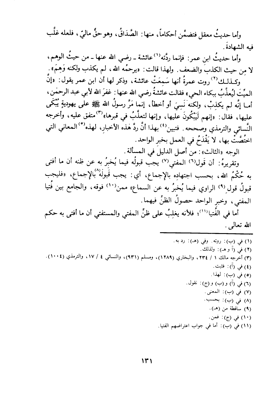 وَكَذَلِكَ رَوَتْ عَمْرَةُ أَنَّهَا سَمِعَتْ عَائِشَةَ، وَذُكِرَ لَهَا أَنَّ ابْنَ عُمَرَ يَقُولُ: إِنَّ الْمَيِّتَ لَيُعَذَّبُ بِبُكَاءِ الْحَيِّ؛ فَقَالَتْ عَائِشَةُ رَضِيَ اللَّهُ عَنْهَا: غَفَرَ اللَّهُ لِأَبِي عَبْدِ الرَّحْمَنِ، أَمَا إِنَّهُ لَمْ يَكْذِبْ، وَلَكِنَّهُ نَسِيَ أَوْ أَخْطَأَ، إِنَّمَا مَرَّ رَسُولُ اللَّهِ صَلَّى اللَّهُ عَلَيْهِ وَسَلَّمَ، عَلَى يَهُودِيَّةٍ يُبْكَى عَلَيْهَا؛ فَقَالَ: إِنَّهُمْ لَيَبْكُونَ عَلَيْهَا، وَإِنَّهَا لَتُعَذَّبُ فِي قَبْرِهَا. مُتَّفَقٌ عَلَيْهِ، وَأَخْرَجَهُ النَّسَائِيُّ وَالتِّرْمِذِيُّ وَصَحَّحَهُ. فَتَبَيَّنَ بِهَذَا أَنَّ رَدَّ هَذِهِ الْأَخْبَارِ، لِهَذِهِ الْمَعَانِي الَّتِي اخْتُصَّتْ بِهَا، لَا يَقْدَحُ فِي الْعَمَلِ بِخَبَرِ الْوَاحِدِ.