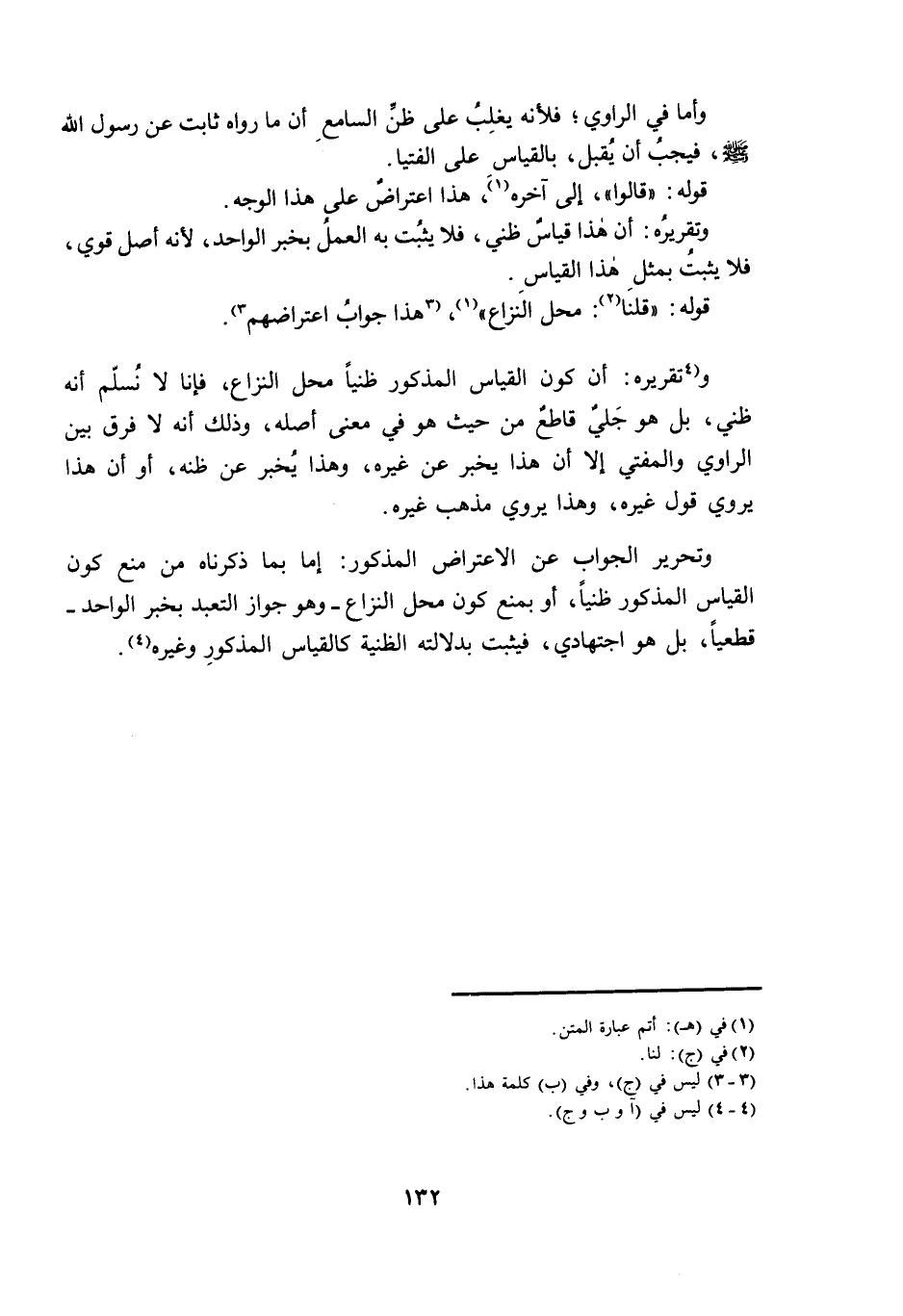 وَتَقْرِيرُهُ: أَنَّ كَوْنَ الْقِيَاسِ الْمَذْكُورِ ظَنِّيًّا مَحَلَّ النِّزَاعِ؛ فَإِنَّا لَا نُسَلِّمُ أَنَّهُ ظَنِّيٌّ، بَلْ هُوَ جَلِيٌّ قَاطِعٌ مِنْ حَيْثُ هُوَ فِي مَعْنَى أَصْلِهِ، وَذَلِكَ أَنَّهُ لَا فَرْقَ بَيْنَ الرَّاوِي وَالْمُفْتِي إِلَّا أَنَّ هَذَا يُخْبِرُ عَنْ غَيْرِهِ، وَهَذَا يُخْبِرُ عَنْ ظَنِّهِ، أَوْ أَنَّ هَذَا يَرْوِي قَوْلَ غَيْرِهِ، وَهَذَا يَرْوِي مَذْهَبَ غَيْرِهِ.