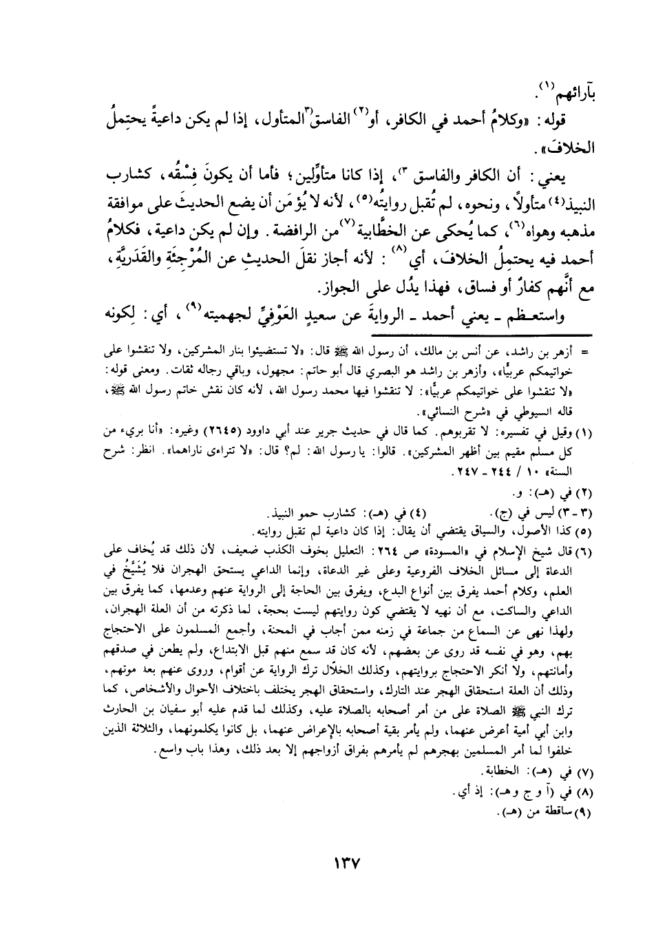 يَعْنِي: أَنَّ الْكَافِرَ وَالْفَاسِقَ، إِذَا كَانَا مُتَأَوِّلِينَ؛ فَأَمَّا أَنْ يَكُونَ فِسْقُهُ، كَشَارِبِ النَّبِيذِ مُتَأَوِّلًا، وَنَحْوِهِ، لَمْ تُقْبَلْ رِوَايَتُهُ؛ لِأَنَّهُ لَا يُؤْمَنُ أَنْ يَضَعَ الْحَدِيثَ عَلَى مُوَافَقَةِ مَذْهَبِهِ وَهَوَاهُ، كَمَا يُحْكَى عَنِ الْخَطَّابِيَّةِ مِنَ الرَّافِضَةِ. وَإِنْ لَمْ يَكُنْ دَاعِيَةً؛ فَكَلَامُ أَحْمَدَ فِيهِ يَحْتَمِلُ الْخِلَافَ، أَيْ: لِأَنَّهُ أَجَازَ نَقْلَ الْحَدِيثِ عَنِ الْمُرْجِئَةِ وَالْقَدَرِيَّةِ، مَعَ أَنَّهُمْ كُفَّارٌ أَوْ فُسَّاقٌ؛ فَهَذَا يَدُلُّ عَلَى الْجَوَازِ.