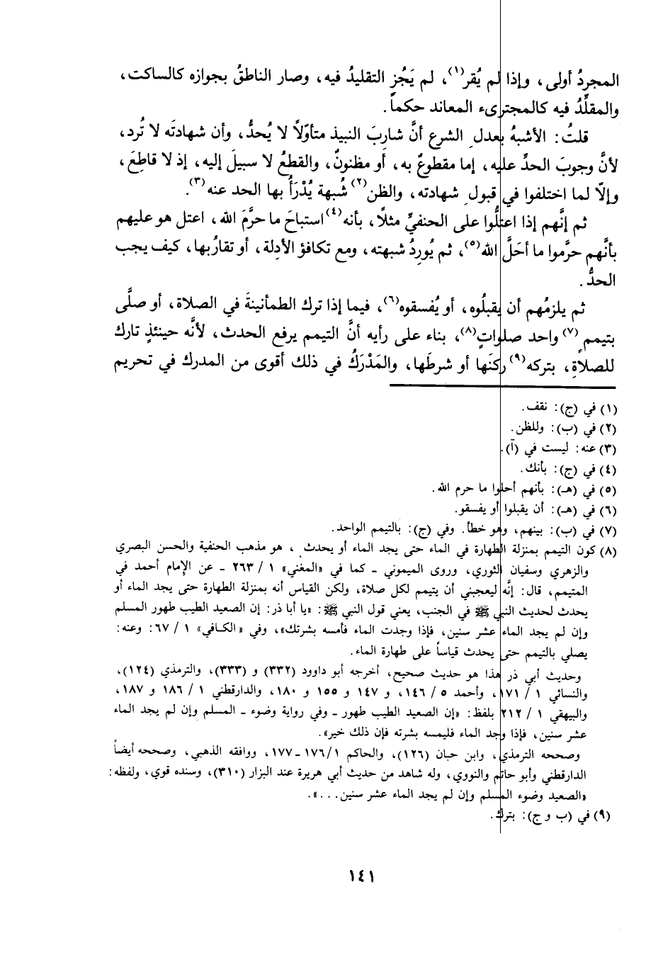 ثُمَّ إِنَّهُمْ إِذَا اعْتَلُّوا عَلَى الْحَنَفِيِّ مَثَلًا، بِأَنَّهُ اسْتَبَاحَ مَا حَرَّمَ اللَّهُ، اعْتَلَّ هُوَ عَلَيْهِمْ بِأَنَّهُمْ حَرَّمُوا مَا أَحَلَّ اللَّهُ، ثُمَّ يُورِدُ شُبْهَتَهُ، وَمَعَ تَكَافُؤِ الْأَدِلَّةِ، أَوْ تَقَارُبِهَا، كَيْفَ يَجِبُ الْحَدُّ.