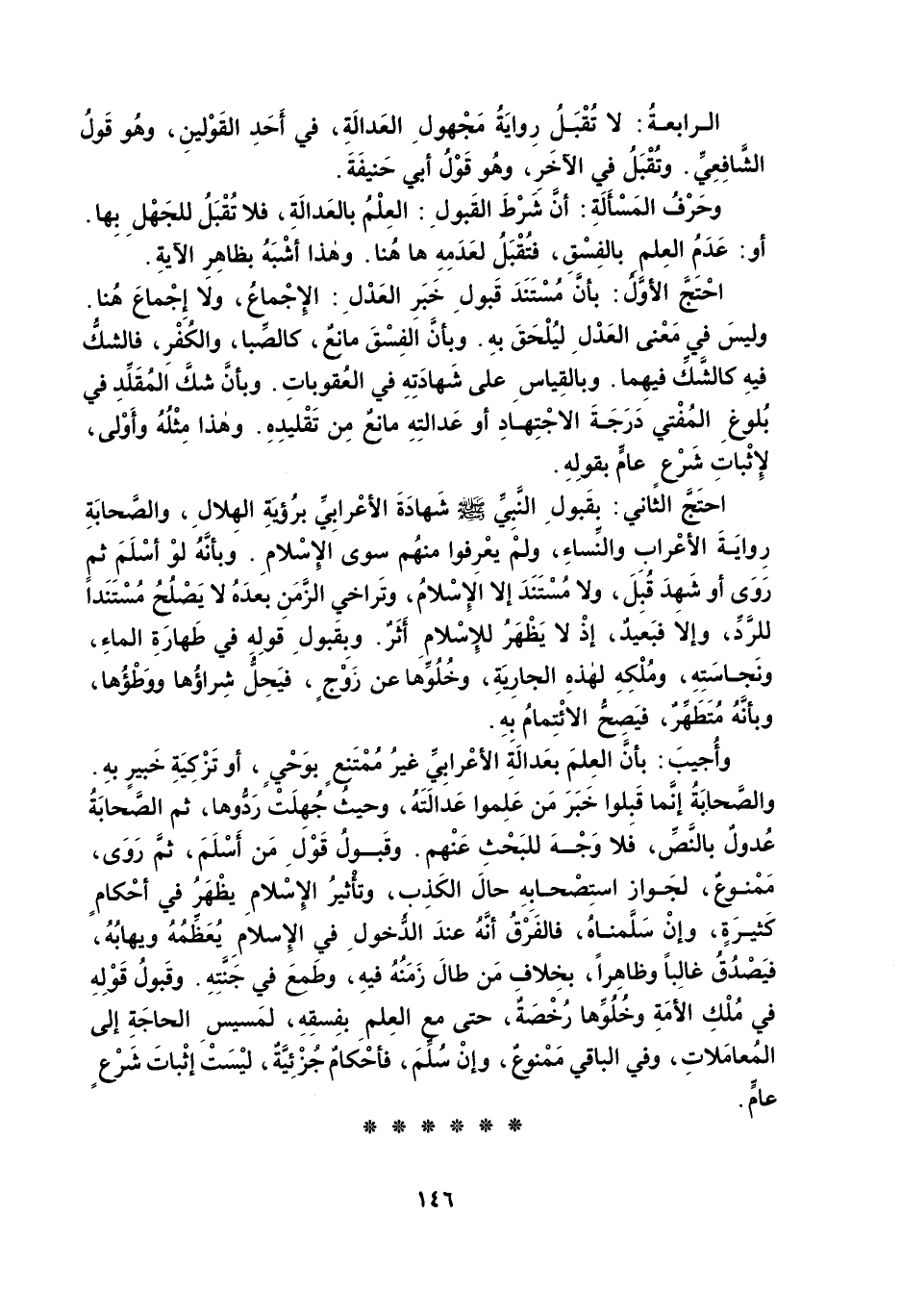 الرَّابِعَةُ: لَا تُقْبَلُ رِوَايَةُ مَجْهُولِ الْعَدَالَةِ، فِي أَحَدِ الْقَوْلَيْنِ، وَهُوَ قَوْلُ الشَّافِعِيِّ، وَتُقْبَلُ فِي الْآخَرِ، وَهُوَ قَوْلُ أَبِي حَنِيفَةَ.