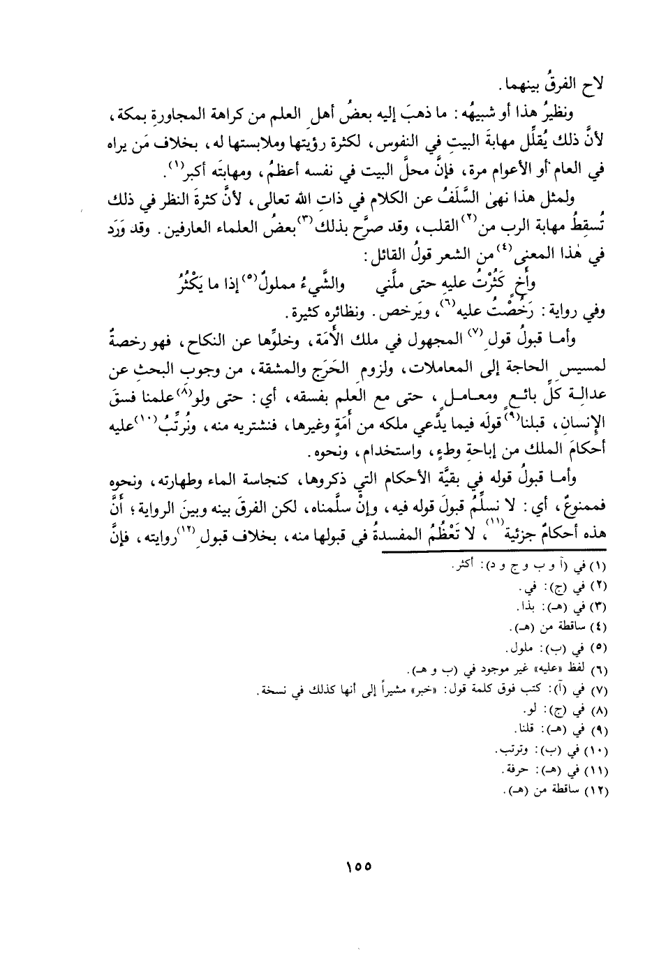 وَلِمِثْلِ هَذَا نَهَى السَّلَفُ عَنِ الْكَلَامِ فِي ذَاتِ اللَّهِ تَعَالَى؛ لِأَنَّ كَثْرَةَ النَّظَرِ فِي ذَلِكَ تُسْقِطُ مَهَابَةَ الرَّبِّ مِنَ الْقَلْبِ، وَقَدْ صَرَّحَ بِذَلِكَ بَعْضُ الْعُلَمَاءِ الْعَارِفِينَ. وَقَدْ وَرَدَ فِي هَذَا الْمَعْنَى مِنَ الشِّعْرِ قَوْلُ الْقَائِلِ: