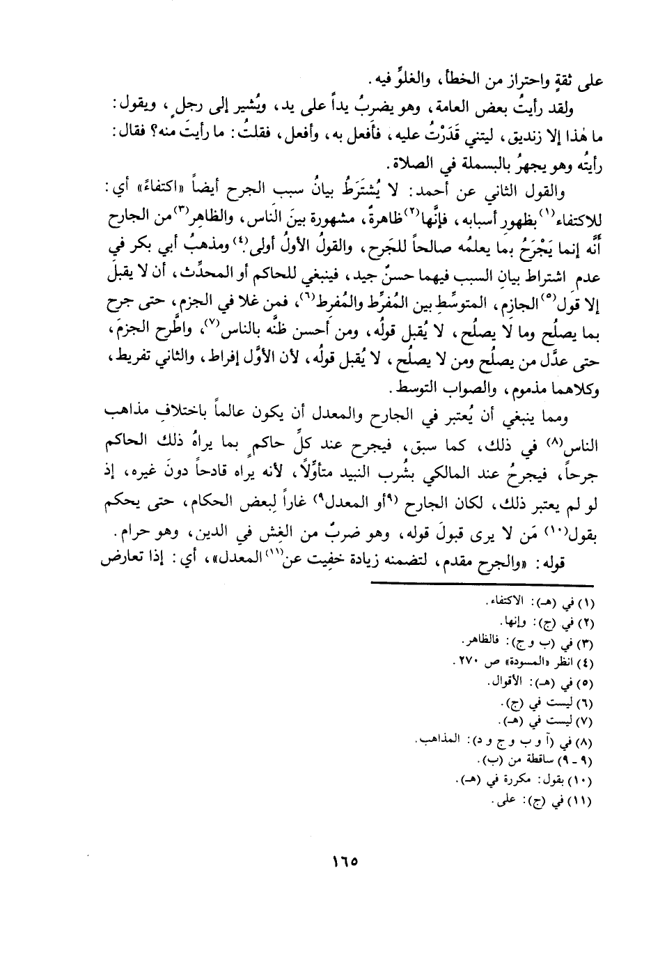 وَالْقَوْلُ الثَّانِي عَنْ أَحْمَدَ: لَا يُشْتَرَطُ بَيَانُ سَبَبِ الْجَرْحِ أَيْضًا «اكْتِفَاءً» أَيْ: لِلِاكْتِفَاءِ بِظُهُورِ أَسْبَابِهِ؛ فَإِنَّهَا ظَاهِرَةٌ، مَشْهُورَةٌ بَيْنَ النَّاسِ، وَالظَّاهِرُ مِنَ الْجَارِحِ أَنَّهُ إِنَّمَا يَجْرَحُ بِمَا يَعْلَمُهُ صَالِحًا لِلْجَرْحِ، وَالْقَوْلُ الْأَوَّلُ أَوْلَى. وَمَذْهَبُ أَبِي بَكْرٍ فِي عَدَمِ اشْتِرَاطِ بَيَانِ السَّبَبِ فِيهِمَا حَسَنٌ جَيِّدٌ؛ فَيَنْبَغِي لِلْحَاكِمِ أَوِ الْمُحَدِّثِ، أَنْ لَا يَقْبَلَ إِلَّا قَوْلَ الْجَازِمِ، الْمُتَوَسِّطِ بَيْنَ الْمُفَرِّطِ وَالْمُفْرِطِ؛ فَمَنْ غَلَا فِي الْجَزْمِ، حَتَّى جَرَحَ بِمَا يَصْلُحُ وَمَا لَا يَصْلُحُ، لَا يُقْبَلُ قَوْلُهُ؛ لِأَنَّ الْأَوَّلَ إِفْرَاطٌ، وَالثَّانِي تَفْرِيطٌ، وَكِلَاهُمَا مَذْمُومٌ، وَالصَّوَابُ التَّوَسُّطُ.