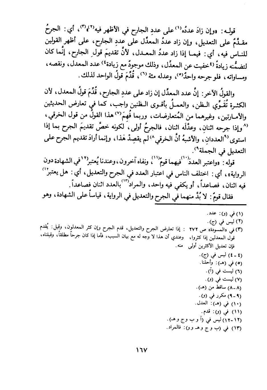 قَوْلُهُ: «وَاعْتَبَرَ الْعَدَدَ فِيهِمَا قَوْمٌ، وَنَفَاهُ آخَرُونَ، وَعِنْدَنَا يُعْتَبَرُ فِي الشَّهَادَةِ دُونَ الرِّوَايَةِ» ، أَيَ: اخْتَلَفَ النَّاسُ فِي اعْتِبَارِ الْعَدَدِ فِي الْجَرْحِ وَالتَّعْدِيلِ، أَيْ: هَلْ يُعْتَبَرُ فِيهِ اثْنَانِ؛ فَصَاعِدًا، أَوْ يَكْفِي فِيهِ وَاحِدٌ، وَالْمُرَادُ بِالْعَدَدِ اثْنَانِ فَصَاعِدًا.