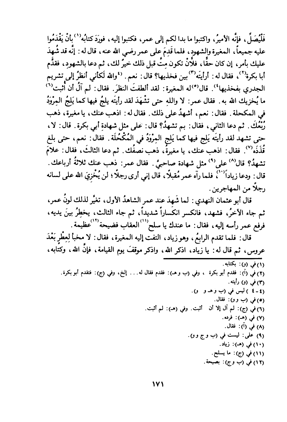 فَلْيُصَلِّ؛ فَإِنَّهُ الْأَمِيرُ، وَاكْتُبُوا مَا بَدَا لَكُمْ إِلَى عُمَرَ؛ فَكَتَبُوا إِلَيْهِ؛ فَوَرَدَ كِتَابُهُ بِأَنْ يَقْدَمُوا عَلَيْهِ جَمِيعًا، الْمُغِيرَةُ وَالشُّهُودُ؛ فَلَمَّا قَدِمَ عَلَى عُمَرَ رَضِيَ اللَّهُ عَنْهُ، قَالَ لَهُ: إِنَّهُ قَدْ شُهِدَ عَلَيْكَ بِأَمْرٍ، إِنْ كَانَ حَقًّا؛ فَلَأَنْ تَكُونَ مُتَّ قَبْلَ ذَلِكَ خَيْرٌ لَكَ، ثُمَّ دَعَا بِالشُّهُودِ؛ فَقَدِمَ أَبُو بَكْرَةَ؛ فَقَالَ لَهُ: أَرَأَيْتَهُ بَيْنَ فَخِذَيْهَا؟ قَالَ: نَعَمْ، وَاللَّهِ لَكَأَنِّي أَنْظُرُ إِلَى تَشْرِيمِ الْجُدَرِيِّ بِفَخِذَيْهَا، قَالَ لَهُ الْمُغِيرَةُ: لَقَدْ أَلْطَفْتَ النَّظَرَ. فَقَالَ: لَمْ آلُ أَنْ أُثْبِتَ مَا يُخْزِيكَ اللَّهُ بِهِ. فَقَالَ عُمَرُ: لَا وَاللَّهِ حَتَّى تَشْهَدَ لَقَدْ رَأَيْتَهُ يَلِجُ فِيهَا كَمَا يَلِجُ الْمِرْوَدُ فِي الْمُكْحُلَةِ. فَقَالَ: نَعَمْ أَشْهَدُ عَلَى ذَلِكَ؛ فَقَالَ لَهُ: اذْهَبْ عَنْكَ، يَا مُغِيرَةُ، ذَهَبَ رُبْعُكَ. ثُمَّ دَعَا الثَّانِي؛ فَقَالَ: بِمَ تَشْهَدُ؟ قَالَ: عَلَى مِثْلِ شَهَادَةِ أَبِي بَكْرَةَ، قَالَ: لَا، حَتَّى تَشْهَدَ لَقَدْ رَأَيْتَهُ يَلِجُ فِيهَا كَمَا يَلِجُ الْمِرْوَدُ فِي الْمُكْحُلَةِ. فَقَالَ: نَعَمْ، حَتَّى بَلَغَ قُذَذَهُ. فَقَالَ: اذْهَبْ عَنْكَ، يَا مُغِيرَةُ، ذَهَبَ نِصْفُكَ. ثُمَّ دَعَا الثَّالِثَ؛ فَقَالَ: عَلَامَ تَشْهَدُ؟ قَالَ عَلَى مِثْلِ شَهَادَةِ صَاحِبَيَّ؛ فَقَالَ عُمَرُ: ذَهَبَ عَنْكَ ثَلَاثَةُ أَرْبَاعِكَ. قَالَ: وَدَعَا زِيَادًا فَلَمَّا رَآهُ عُمَرُ مُقْبِلًا، قَالَ: إِنِّي أَرَى رَجُلًا، لَنْ يُخْزِيَ اللَّهُ عَلَى لِسَانِهِ رَجُلًا مِنَ الْمُهَاجِرِينَ.