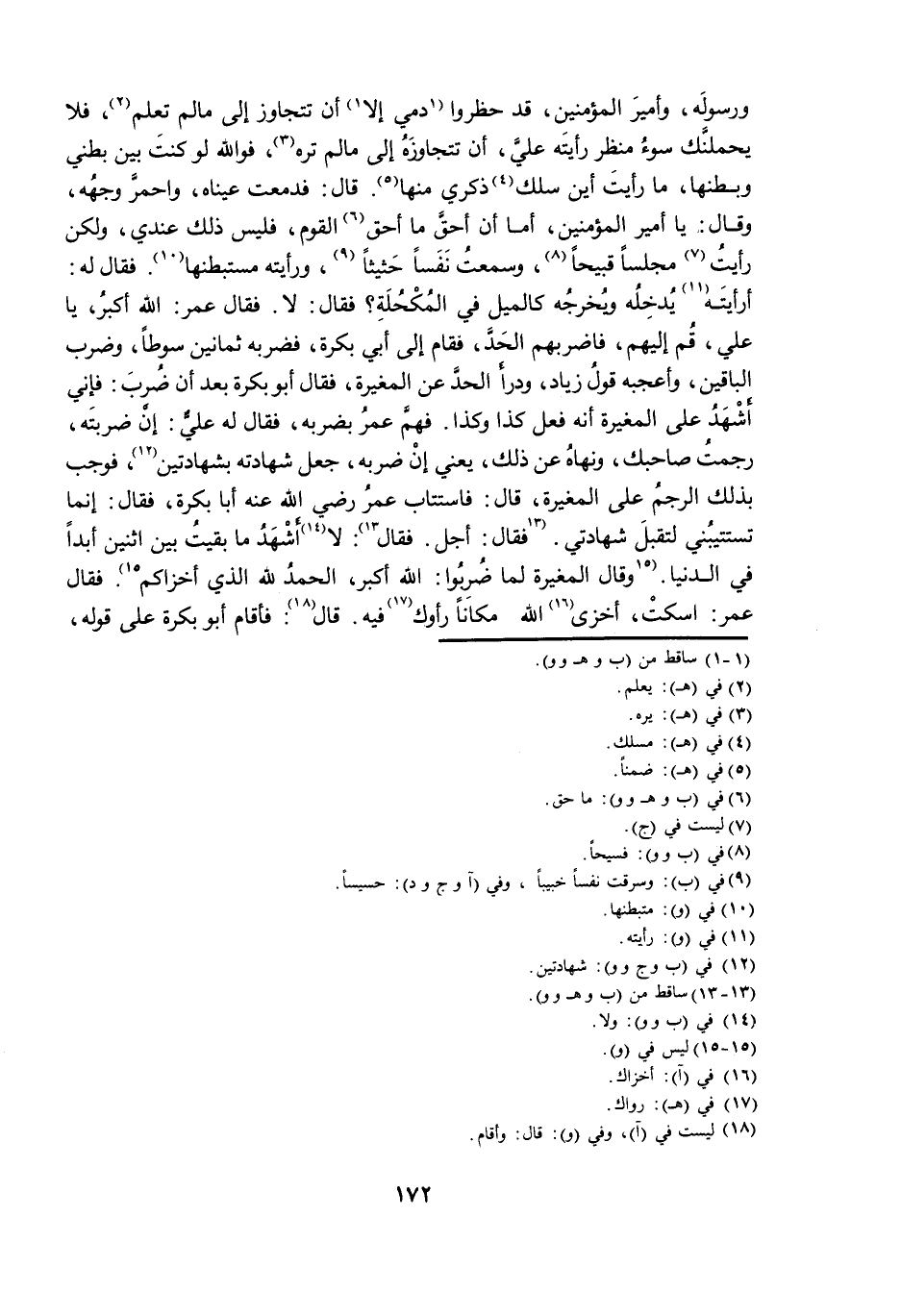 وَرَسُولَهُ، وَأَمِيرَ الْمُؤْمِنِينَ، قَدْ حَظَرُوا دَمِي إِلَّا أَنْ تَتَجَاوَزَ إِلَى مَا لَمْ تَعْلَمْ؛ فَلَا يَحْمِلَنَّكَ سُوءُ مَنْظَرٍ رَأَيْتَهُ عَلَيَّ، أَنْ تَتَجَاوَزَهُ إِلَى مَا لَمْ تَرَهُ؛ فَوَاللَّهِ لَوْ كُنْتَ بَيْنَ بَطْنِي وَبَطْنِهَا، مَا رَأَيْتَ أَيْنَ سَلَكَ ذَكَرِي مِنْهَا، قَالَ: فَدَمَعَتْ عَيْنَاهُ، وَاحْمَرَّ وَجْهُهُ، وَقَالَ: يَا أَمِيرَ الْمُؤْمِنِينَ، أَمَّا أَنْ أُحِقَّ مَا أَحَقَّ الْقَوْمُ؛ فَلَيْسَ ذَلِكَ عِنْدِي، وَلَكِنْ رَأَيْتُ مَجْلِسًا قَبِيحًا، وَسَمِعْتُ نَفَسًا حَثِيثًا، وَرَأَيْتُهُ مُسْتَبْطِنَهَا. فَقَالَ لَهُ: أَرَأَيْتَهُ يُدْخِلُهُ وَيُخْرِجُهُ كَالْمَيْلِ فِي الْمُكْحُلَةِ؟ فَقَالَ: لَا. فَقَالَ عُمَرُ: اللَّهُ أَكْبَرُ، يَا عَلِيُّ، قُمْ إِلَيْهِمْ؛ فَاضْرِبْهُمُ الْحَدَّ؛ فَقَامَ إِلَى أَبِي بَكْرَةَ فَضَرَبَهُ ثَمَانِينَ سَوْطًا وَضَرَبَ الْبَاقِينَ، وَأَعْجَبَهُ قَوْلُ زِيَادٍ، وَدَرَأَ الْحَدَّ عَنِ الْمُغِيرَةِ؛ فَقَالَ أَبُو بَكْرَةَ بَعْدَ أَنْ ضُرِبَ: فَإِنِّي أَشْهَدُ عَلَى الْمُغِيرَةِ أَنَّهُ فَعَلَ كَذَا وَكَذَا. فَهَمَّ عُمَرُ بِضَرْبِهِ؛ فَقَالَ لَهُ عَلِيٌّ: إِنْ ضَرَبْتَهُ، رَجَمْتَ صَاحِبَكَ، وَنَهَاهُ عَنْ ذَلِكَ، يَعْنِي إِنْ ضَرَبَهُ، جَعَلَ شَهَادَتَهُ بِشَهَادَتَيْنِ؛ فَوَجَبَ بِذَلِكَ الرَّجْمُ عَلَى الْمُغِيرَةِ، قَالَ: فَاسْتَتَابَ عُمَرُ رَضِيَ اللَّهُ عَنْهُ أَبَا بَكْرَةَ؛ فَقَالَ: إِنَّمَا تَسْتَتِيبُنِي لِتَقْبَلَ شَهَادَتِي. فَقَالَ: أَجَلْ؛ فَقَالَ: لَا أَشْهَدُ مَا بَقِيتُ بَيْنَ اثْنَيْنِ أَبَدًا فِي الدُّنْيَا. وَقَالَ الْمُغِيرَةُ لَمَّا ضُرِبُوا: اللَّهُ أَكْبَرُ، الْحَمْدُ لِلَّهِ الَّذِي أَخْزَاكُمْ؛ فَقَالَ عُمَرُ: اسْكُتْ، أَخْزَى اللَّهُ مَكَانًا رَأَوْكَ فِيهِ. قَالَ: فَأَقَامَ أَبُو بَكْرَةَ عَلَى قَوْلِهِ،