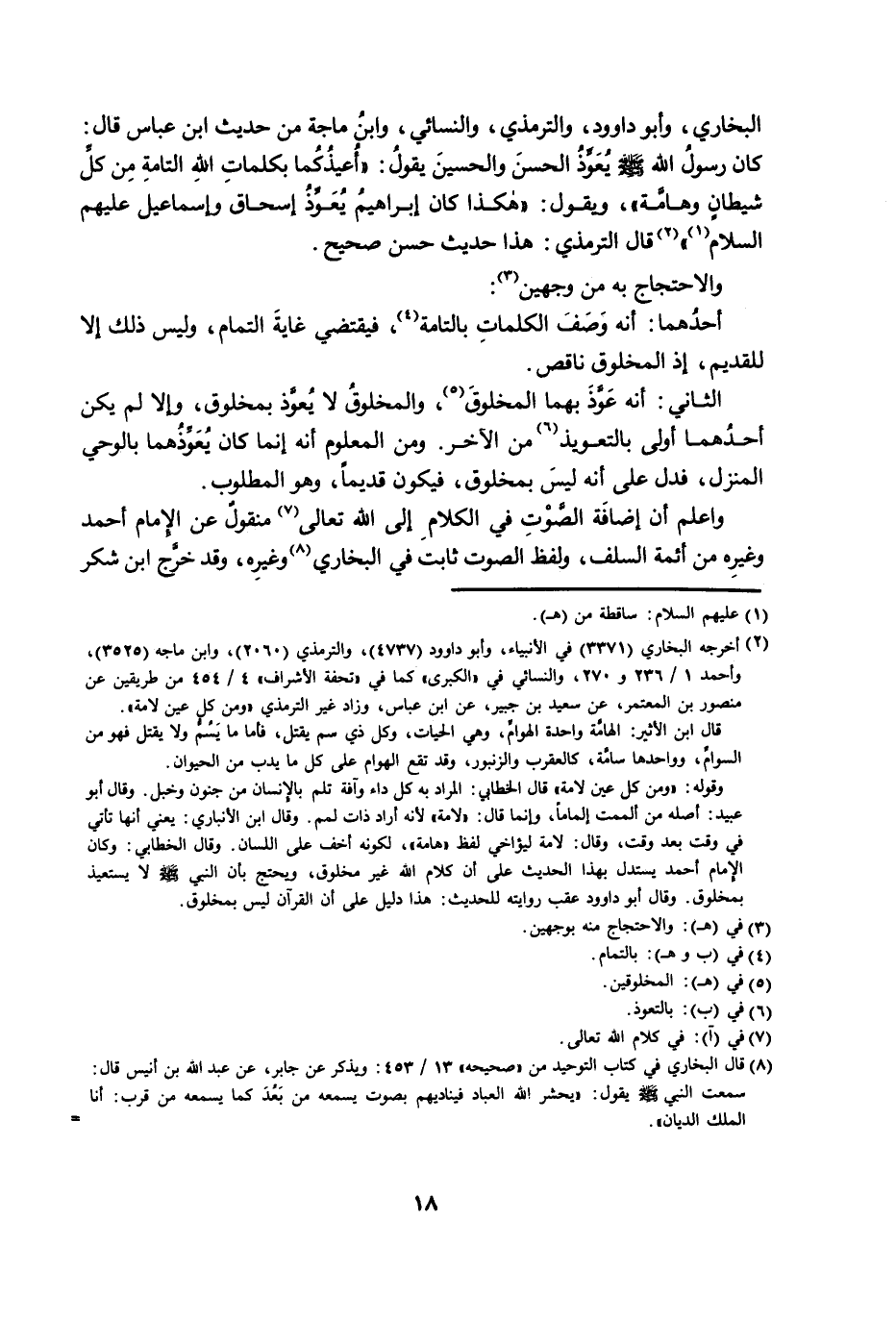 الْبُخَارِيُّ، وَأَبُو دَاوُدَ، وَالتِّرْمِذِيُّ، وَالنَّسَائِيُّ، وَابْنُ مَاجَهْ مِنْ حَدِيثِ ابْنِ عَبَّاسٍ قَالَ: كَانَ رَسُولُ اللَّهِ - صَلَّى اللَّهُ عَلَيْهِ وَسَلَّمَ - يُعَوِّذُ الْحَسَنَ وَالْحُسَيْنَ يَقُولُ: أُعِيذُكُمَا بِكَلِمَاتِ اللَّهِ التَّامَّةِ مِنْ كُلِّ شَيْطَانٍ وَهَامَّةٍ، وَيَقُولُ: هَكَذَا كَانَ إِبْرَاهِيمُ يُعَوِّذُ إِسْحَاقَ وَإِسْمَاعِيلَ عَلَيْهِمُ السَّلَامُ، قَالَ التِّرْمِذِيُّ: هَذَا حَدِيثٌ حَسَنٌ صَحِيحٌ.