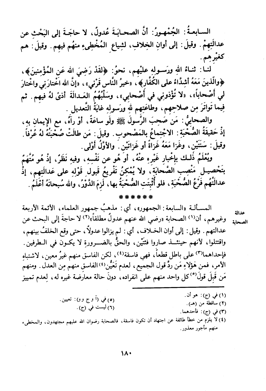 الْمَسْأَلَةُ «السَّابِعَةُ: الْجُمْهُورُ» ، أَيْ: مَذْهَبُ جُمْهُورِ الْعُلَمَاءِ، الْأَئِمَّةِ الْأَرْبَعَةِ وَغَيْرِهِمْ، أَنَّ الصَّحَابَةَ رَضِيَ اللَّهُ عَنْهُمْ عُدُولٌ مُطْلَقًا، لَا حَاجَةَ إِلَى الْبَحْثِ عَنْ عَدَالَتِهِمْ. وَقِيلَ: إِلَى أَوَانِ الْخِلَافِ، أَيْ: لَمْ يَزَالُوا عُدُولًا، حَتَّى وَقَعَ الْخُلْفُ بَيْنَهُمْ، وَاقْتَتَلُوا؛ لِأَنَّهُمْ حِينَئِذٍ صَارُوا فِئَتَيْنِ، وَالْحَقُّ بِالضَّرُورَةِ لَا يَكُونُ فِي الطَّرَفَيْنِ. فَإِحْدَاهُمَا عَلَى بَاطِلٍ قَطْعًا؛ فَهِيَ فَاسِقَةٌ، لَكِنَّ الْفَاسِقَ مِنْهُمْ غَيْرُ مُعَيَّنٍ، لِاشْتِبَاهِ الْأَمْرِ؛ فَمِنْ هَؤُلَاءِ مَنْ رَدَّ قَوْلَ الْجَمِيعِ، لِعَدَمِ تَعَيُّنِ الْفَاسِقِ مِنْهُمْ مِنَ الْعَدْلِ، وَمِنْهُمْ مَنْ قَبِلَ قَوْلَ كُلِّ وَاحِدٍ مِنْهُمْ عَلَى انْفِرَادِهِ، دُونَ حَالَةِ مُعَارَضَةِ غَيْرِهِ لَهُ، لِعَدَمِ تَمْيِيزِ