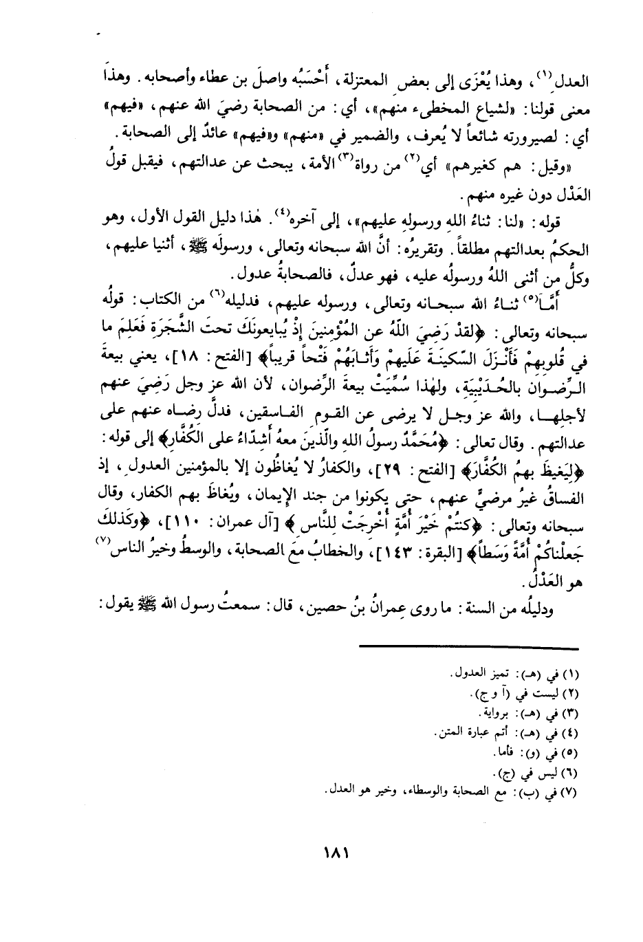 الْعَدْلِ، وَهَذَا يُعْزَى إِلَى بَعْضِ الْمُعْتَزِلَةِ، أَحْسَبُهُ وَاصِلَ بْنَ عَطَاءٍ وَأَصْحَابَهُ. وَهَذَا مَعْنَى قَوْلِنَا: «لِشَيَاعِ الْمُخْطِئِ مِنْهُمْ» ، أَيْ: مِنَ الصَّحَابَةِ رَضِيَ اللَّهُ عَنْهُمْ، «فِيهِمْ» أَيْ: لِصَيْرُورَتِهِ شَائِعًا لَا يُعْرَفُ، وَالضَّمِيرُ فِي «مِنْهُمْ» ، وَ «فِيهِمْ» عَائِدٌ إِلَى الصَّحَابَةِ.