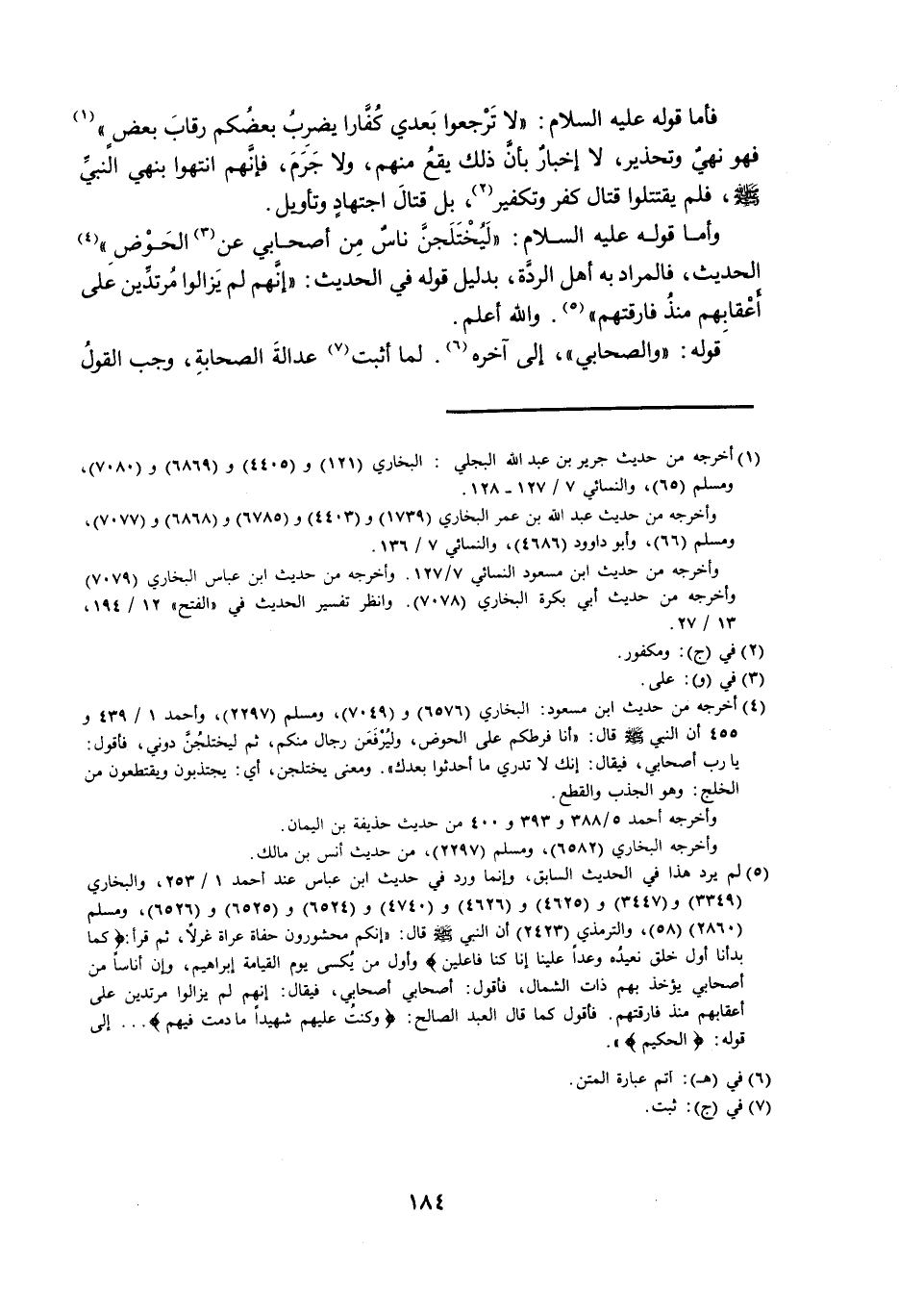فَأَمَّا قَوْلُهُ عَلَيْهِ السَّلَامُ: لَا تَرْجِعُوا بَعْدِي كُفَّارًا يَضْرِبُ بَعْضُكُمْ رِقَابَ بَعْضٍ. فَهُوَ نَهْيٌ وَتَحْذِيرٌ، لَا إِخْبَارٌ بِأَنَّ ذَلِكَ يَقَعُ مِنْهُمْ، وَلَا جَرَمَ؛ فَإِنَّهُمُ انْتَهَوْا بِنَهْيِ النَّبِيِّ، صَلَّى اللَّهُ عَلَيْهِ وَسَلَّمَ، فَلَمْ يَقْتَتِلُوا قِتَالَ كُفْرٍ وَتَكْفِيرٍ، بَلْ قِتَالَ اجْتِهَادٍ وَتَأْوِيلٍ.