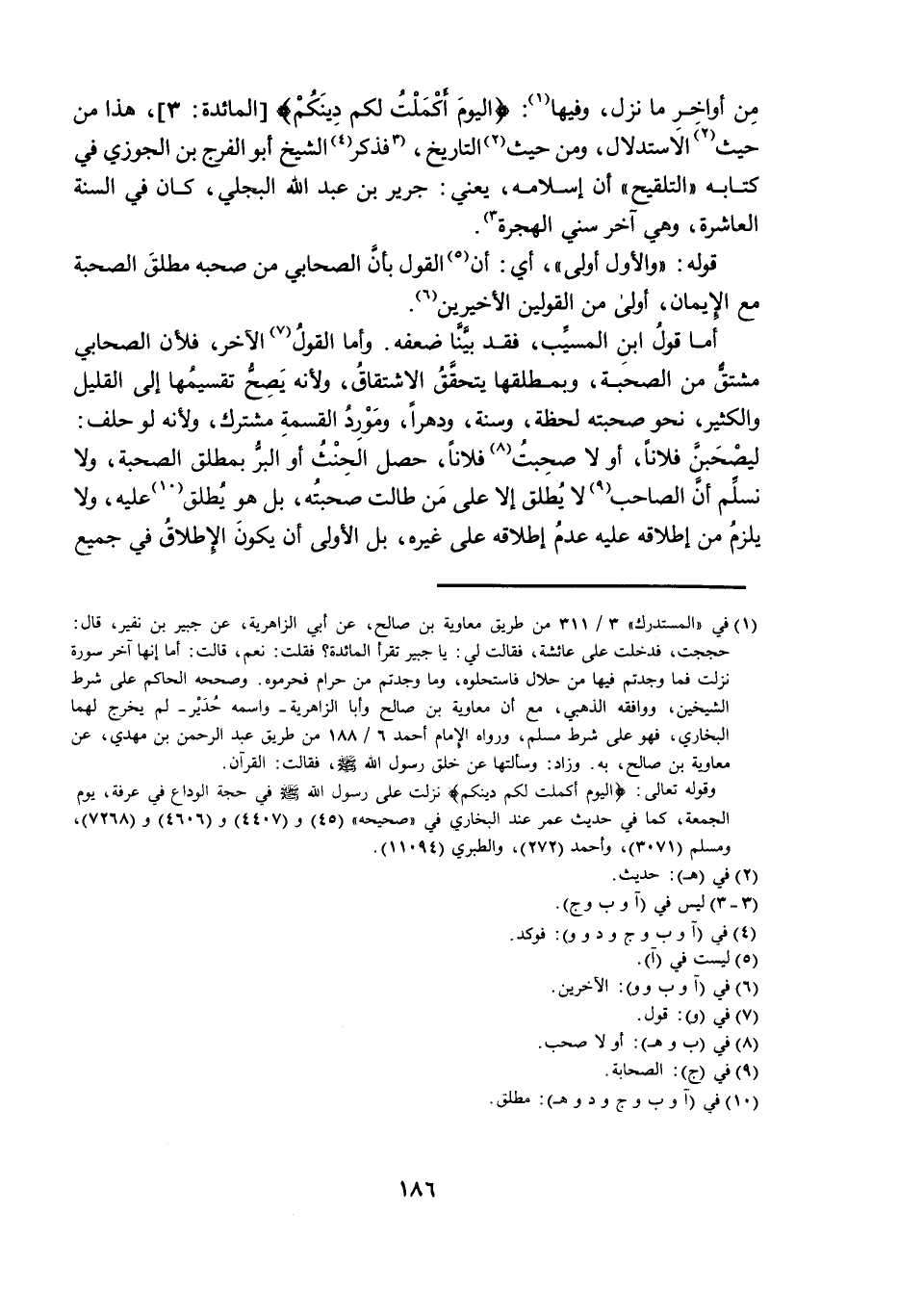 مِنْ أَوَاخِرَ مَا نَزَلَ، وَفِيهَا: {الْيَوْمَ أَكْمَلْتُ لَكُمْ دِينَكُمْ} [الْمَائِدَةِ: 3] ، هَذَا مِنْ حَيْثُ الِاسْتِدْلَالِ، وَمِنْ حَيْثُ التَّارِيخِ؛ فَذَكَرَ الشَّيْخُ أَبُو الْفَرَجِ بْنُ الْجَوْزِيِّ فِي كِتَابِهِ «التَّلْقِيحُ» أَنَّ إِسْلَامَهُ، يَعْنِي: جَرِيرَ بْنَ عَبْدِ اللَّهِ الْبَجَلِيَّ، كَانَ فِي السَّنَةِ الْعَاشِرَةِ، وَهِيَ آخِرُ سِنِي الْهِجْرَةِ.
