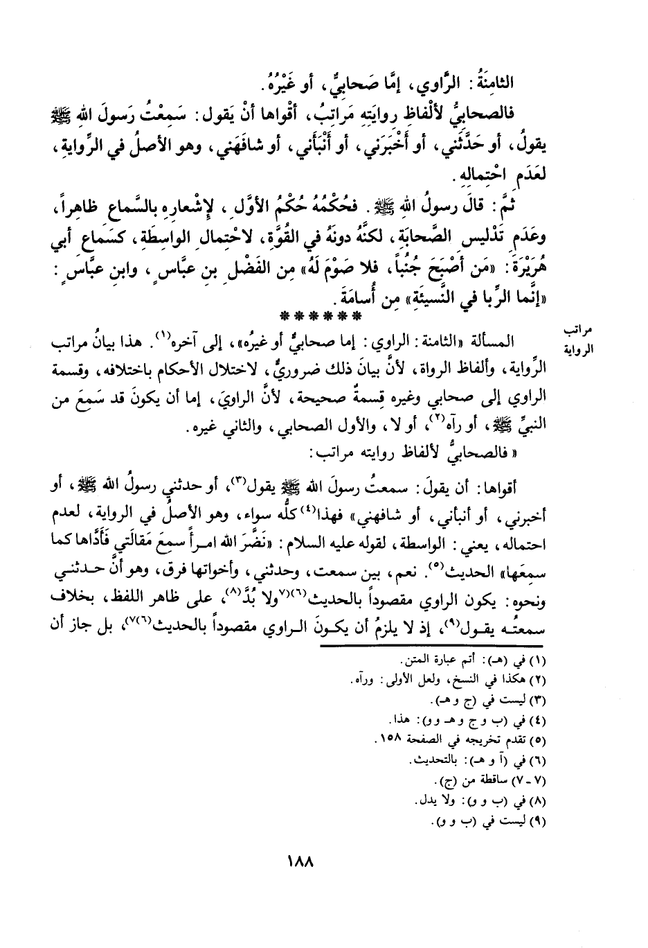 الْمَسْأَلَةُ «الثَّامِنَةُ: الرَّاوِي: إِمَّا صَحَابِيٌّ أَوْ غَيْرُهُ» ، إِلَى آخِرِهِ، هَذَا بَيَانُ مَرَاتِبِ الرِّوَايَةِ، وَأَلْفَاظُ الرُّوَاةِ؛ لِأَنَّ بَيَانَ ذَلِكَ ضَرُورِيٌّ، لِاخْتِلَالِ الْأَحْكَامِ بِاخْتِلَافِهِ، وَقِسْمَةُ الرَّاوِي إِلَى صَحَابِيِّ وَغَيْرِهِ قِسْمَةٌ صَحِيحَةٌ؛ لِأَنَّ الرَّاوِيَ؛ إِمَّا أَنْ يَكُونَ قَدْ سَمِعَ مِنَ النَّبِيِّ، صَلَّى اللَّهُ عَلَيْهِ وَسَلَّمَ، أَوْ رَآهُ، أَوْ لَا، وَالْأَوَّلُ الصَّحَابِيُّ، وَالثَّانِي غَيْرُهُ.