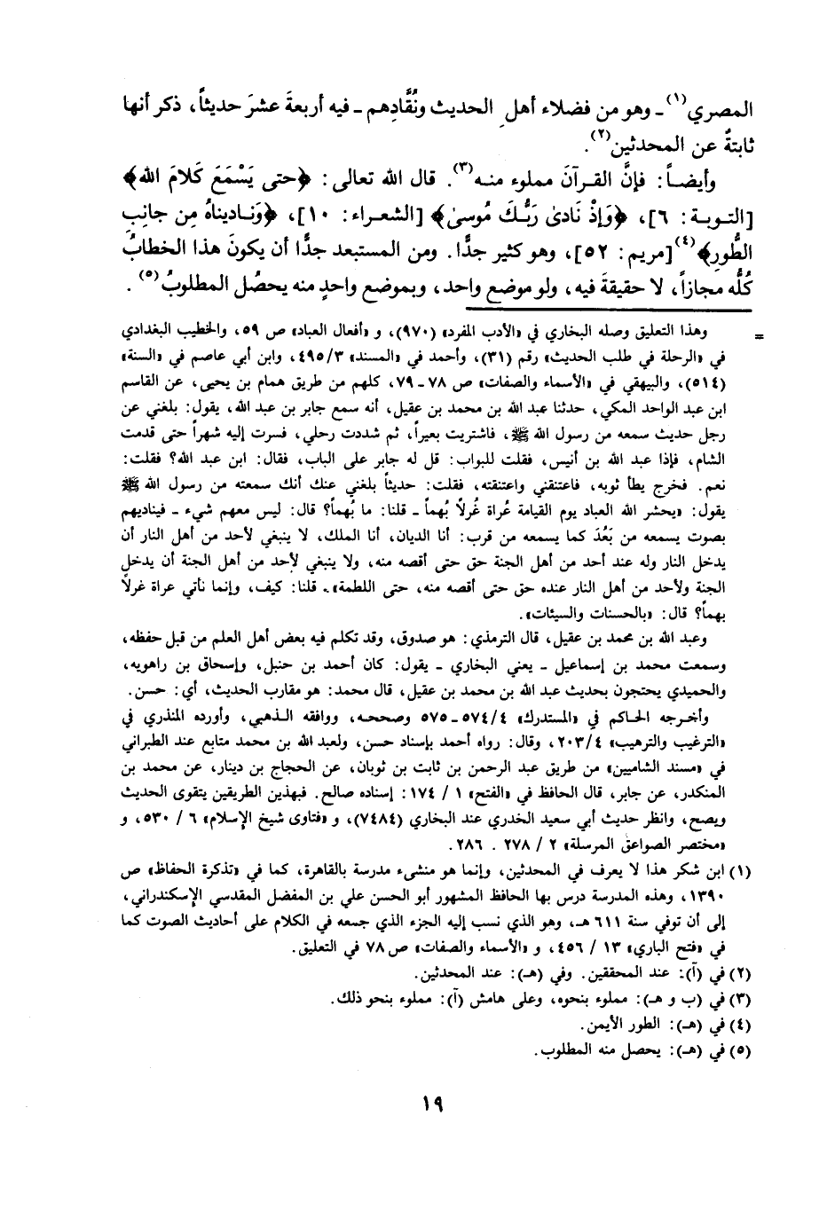 وَأَيْضًا: فَإِنَّ الْقُرْآنَ مَمْلُوءٌ مِنْهُ. قَالَ اللَّهُ تَعَالَى: {حَتَّى يَسْمَعَ كَلَامَ اللَّهِ} [التَّوْبَةِ: 6] ، {وَإِذْ نَادَى رَبُّكَ مُوسَى} [الشُّعَرَاءِ: 10] ، {وَنَادَيْنَاهُ مِنْ جَانِبِ الطُّورِ} [مَرْيَمَ: 52] ، وَهُوَ كَثِيرٌ جِدًّا. وَمِنَ الْمُسْتَبْعَدِ جِدًّا أَنْ يَكُونَ هَذَا الْخِطَابُ كُلُّهُ مَجَازًا، لَا حَقِيقَةَ فِيهِ، وَلَوْ مَوْضِعٌ وَاحِدٌ، وَبِمَوْضِعٍ وَاحِدٍ مِنْهُ يَحْصُلُ الْمَطْلُوبُ.