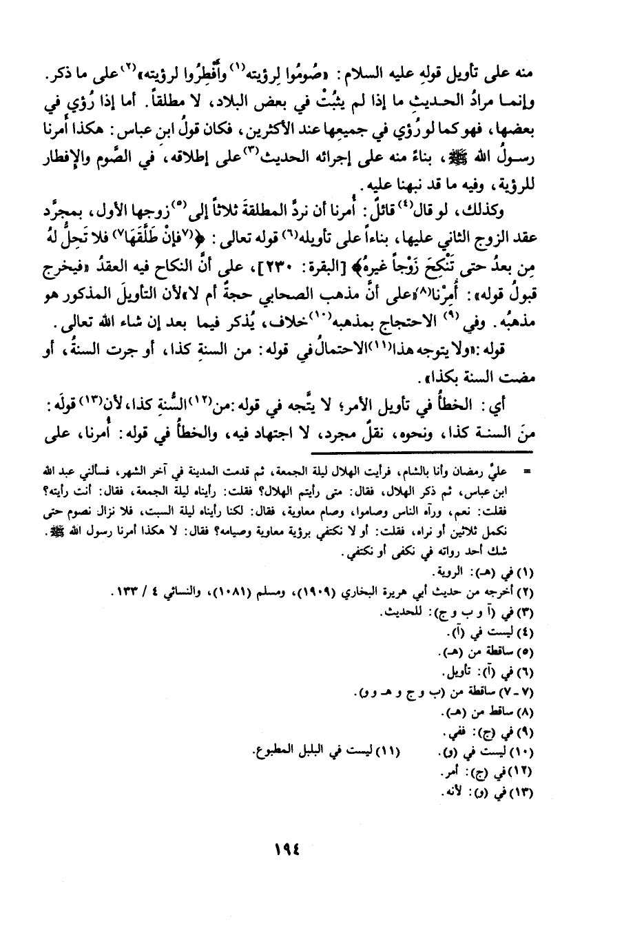 وَإِنَّمَا مُرَادُ الْحَدِيثِ مَا إِذَا لَمْ يَثْبُتْ فِي بَعْضِ الْبِلَادِ، لَا مُطْلَقًا. أَمَّا إِذَا رُئِيَ فِي بَعْضِهَا؛ فَهُوَ كَمَا لَوْ رُئِيَ فِي جَمِيعِهَا عِنْدَ الْأَكْثَرِينَ؛ فَكَانَ قَوْلُ ابْنِ عَبَّاسٍ: هَكَذَا أَمَرَنَا رَسُولُ اللَّهِ، صَلَّى اللَّهُ عَلَيْهِ وَسَلَّمَ، بِنَاءً مِنْهُ عَلَى إِجْرَائِهِ الْحَدِيثَ عَلَى إِطْلَاقِهِ، فِي الصَّوْمِ وَالْإِفْطَارِ لِلرُّؤْيَةِ، وَفِيهِ مَا قَدْ نَبَّهْنَا عَلَيْهِ.