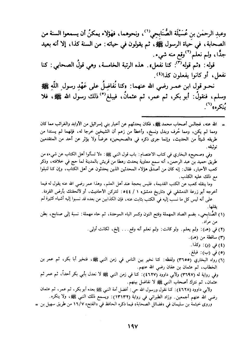نَحْوَ قَوْلِ ابْنِ عُمَرَ رَضِيَ اللَّهُ عَنْهُمَا: «كُنَّا نُفَاضِلُ عَلَى عَهْدِ رَسُولِ اللَّهِ، صَلَّى اللَّهُ عَلَيْهِ وَسَلَّمَ؛ فَنَقُولُ: أَبُو بَكْرٍ، ثُمَّ عُمَرُ، ثُمَّ عُثْمَانُ؛ فَيَبْلُغُ ذَلِكَ رَسُولَ اللَّهِ، صَلَّى اللَّهُ عَلَيْهِ وَسَلَّمَ؛ فَلَا يُنْكِرُهُ» .
