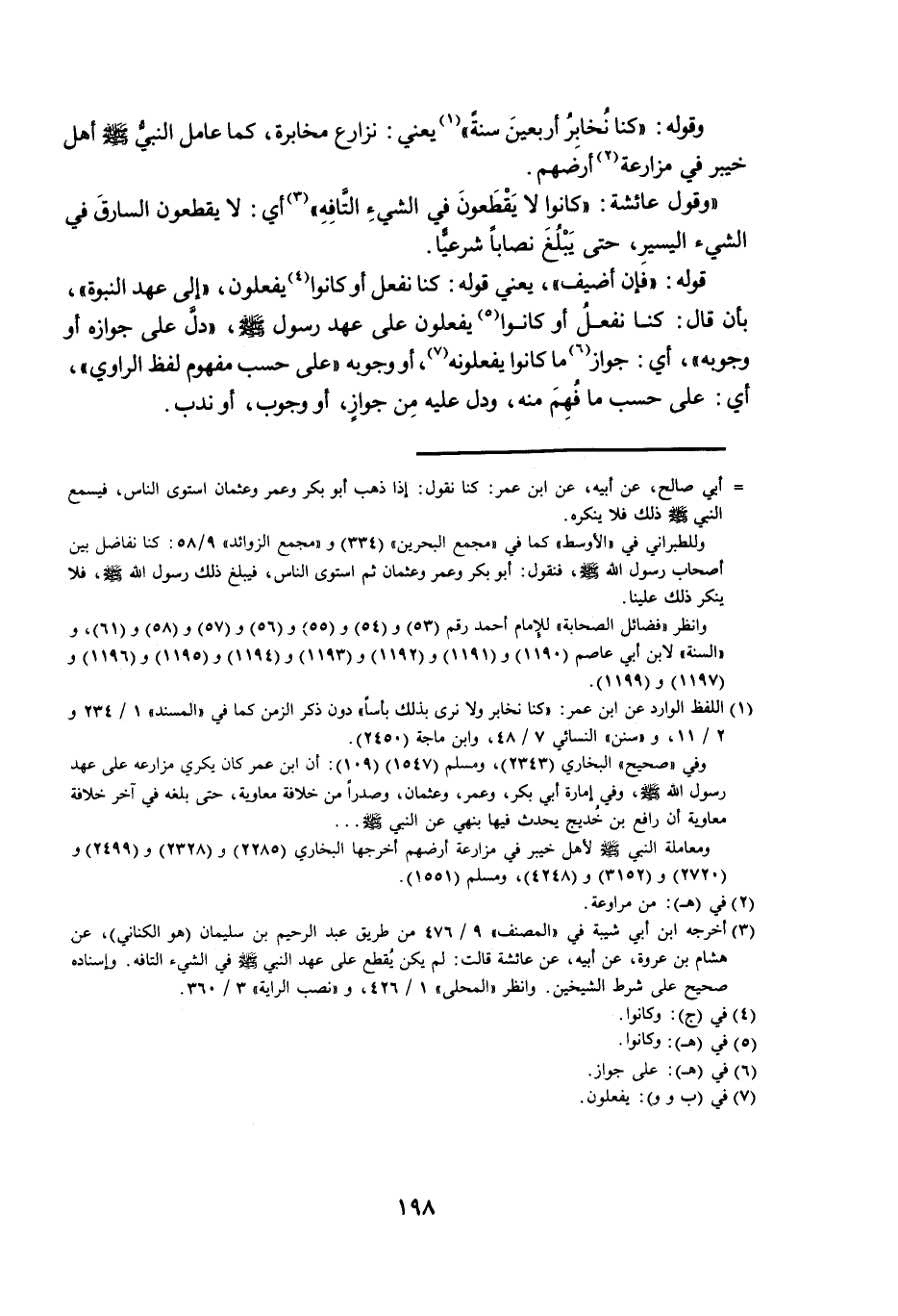وَقَوْلُهُ: «كُنَّا نُخَابِرُ أَرْبَعِينَ سَنَةً» ، يَعْنِي: نُزَارِعُ مُخَابَرَةً، كَمَا عَامَلَ النَّبِيُّ صَلَّى اللَّهُ عَلَيْهِ وَسَلَّمَ، أَهْلَ خَيْبَرَ فِي مُزَارَعَةِ أَرْضِهِمْ.