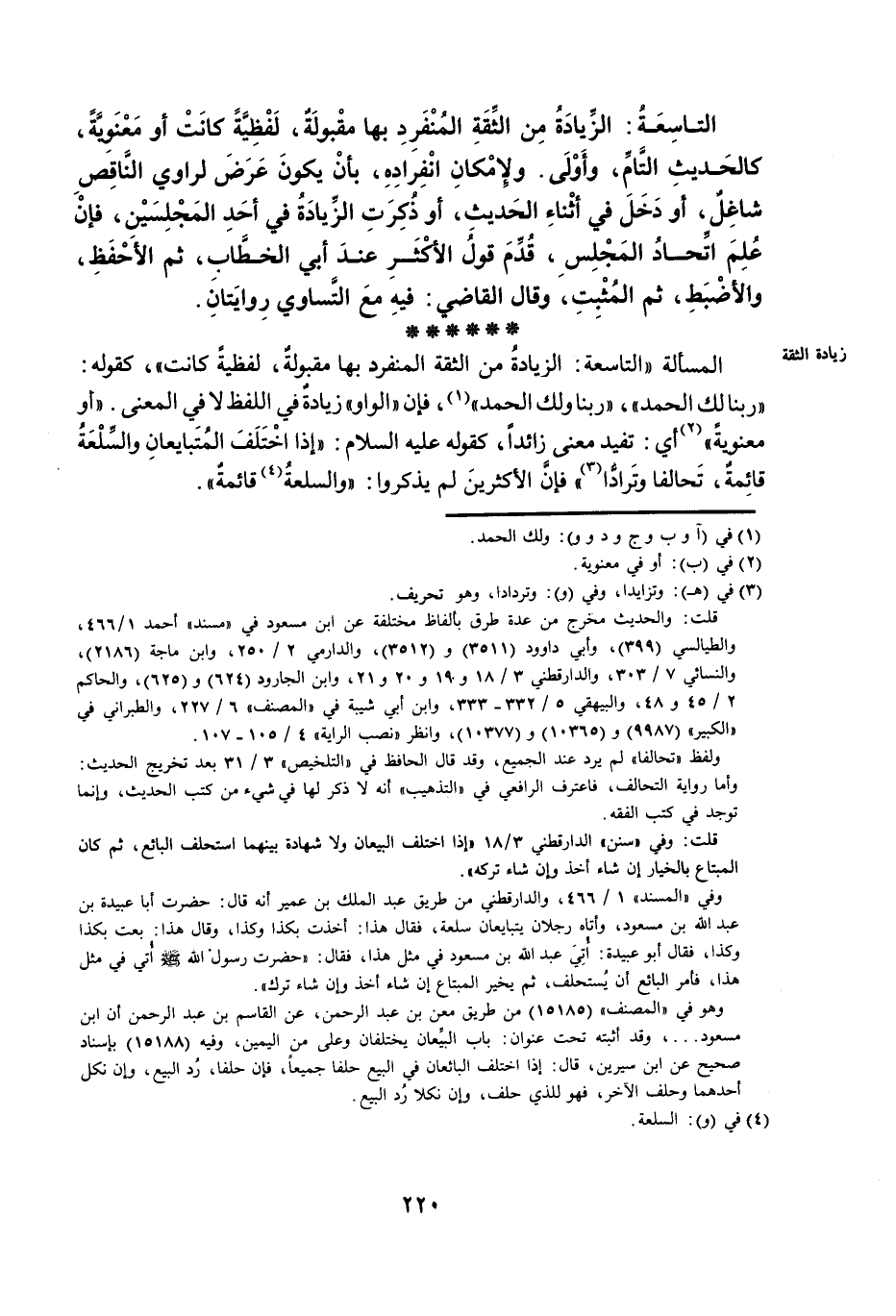 التَّاسِعَةُ: الزِّيَادَةُ مِنَ الثِّقَةِ الْمُنْفَرِدِ بِهَا مَقْبُولَةٌ، لَفْظِيَّةً كَانَتْ أَوْ مَعْنَوِيَّةً، كَالْحَدِيثِ التَّامِّ وَأَوْلَى. وَلِإِمْكَانِ انْفِرَادِهِ، بِأَنْ يَكُونَ عَرَضَ لِرَاوِي النَّاقِصِ شَاغِلٌ، أَوْ دَخَلَ فِي أَثْنَاءِ الْحَدِيثِ، أَوْ ذُكِرَتِ الزِّيَادَةُ فِي أَحَدِ الْمَجْلِسَيْنِ، فَإِنْ عُلِمَ اتِّحَادُ الْمَجْلِسِ، قُدِّمَ قَوْلُ الْأَكْثَرِ عِنْدَ أَبِي الْخَطَّابِ، ثُمَّ الْأَحْفَظِ، وَالْأَضْبَطِ، ثُمَّ الْمُثْبِتِ، وَقَالَ الْقَاضِي: فِيهِ مَعَ التَّسَاوِي رِوَايَتَانِ.