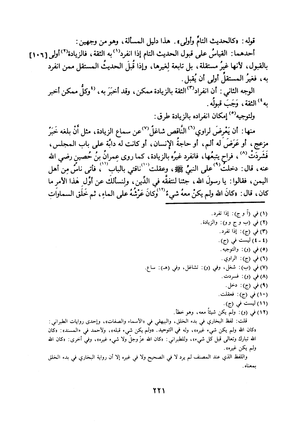 مِنْهَا: أَنْ يَعْرِضَ لِرَاوِي النَّاقِصِ شَاغِلٌ عَنْ سَمَاعِ الزِّيَادَةِ، مِثْلَ أَنْ بَلَغَهُ خَبَرٌ مُزْعِجٌ، أَوْ عَرَضَ لَهُ أَلَمٌ، أَوْ حَاجَةُ الْإِنْسَانِ، أَوْ كَانَتْ لَهُ دَابَّةٌ عَلَى بَابِ الْمَجْلِسِ؛ فَشَرَدَتْ؛ فَرَاحَ يَتْبَعُهَا؛ فَانْفَرَدَ غَيْرُهُ بِالزِّيَادَةِ، كَمَا رَوَى عِمْرَانُ بْنُ حُصَيْنٍ رَضِيَ اللَّهُ عَنْهُ، قَالَ: دَخَلْتُ عَلَى النَّبِيِّ، صَلَّى اللَّهُ عَلَيْهِ وَسَلَّمَ، وَعَقَلْتُ نَاقَتِي بِالْبَابِ؛ فَأَتَى نَاسٌ مِنْ أَهْلِ الْيَمَنِ؛ فَقَالُوا: يَا رَسُولَ اللَّهِ، جِئْنَا لِنَتَفَقَّهَ فِي الدِّينِ، وَلِنَسْأَلَكَ عَنْ أَوَّلِ هَذَا الْأَمْرِ مَا كَانَ، قَالَ: كَانَ اللَّهُ وَلَمْ يَكُنْ مَعَهُ شَيْءٌ وَكَانَ عَرْشُهُ عَلَى الْمَاءِ، ثُمَّ خَلَقَ السَّمَاوَاتِ