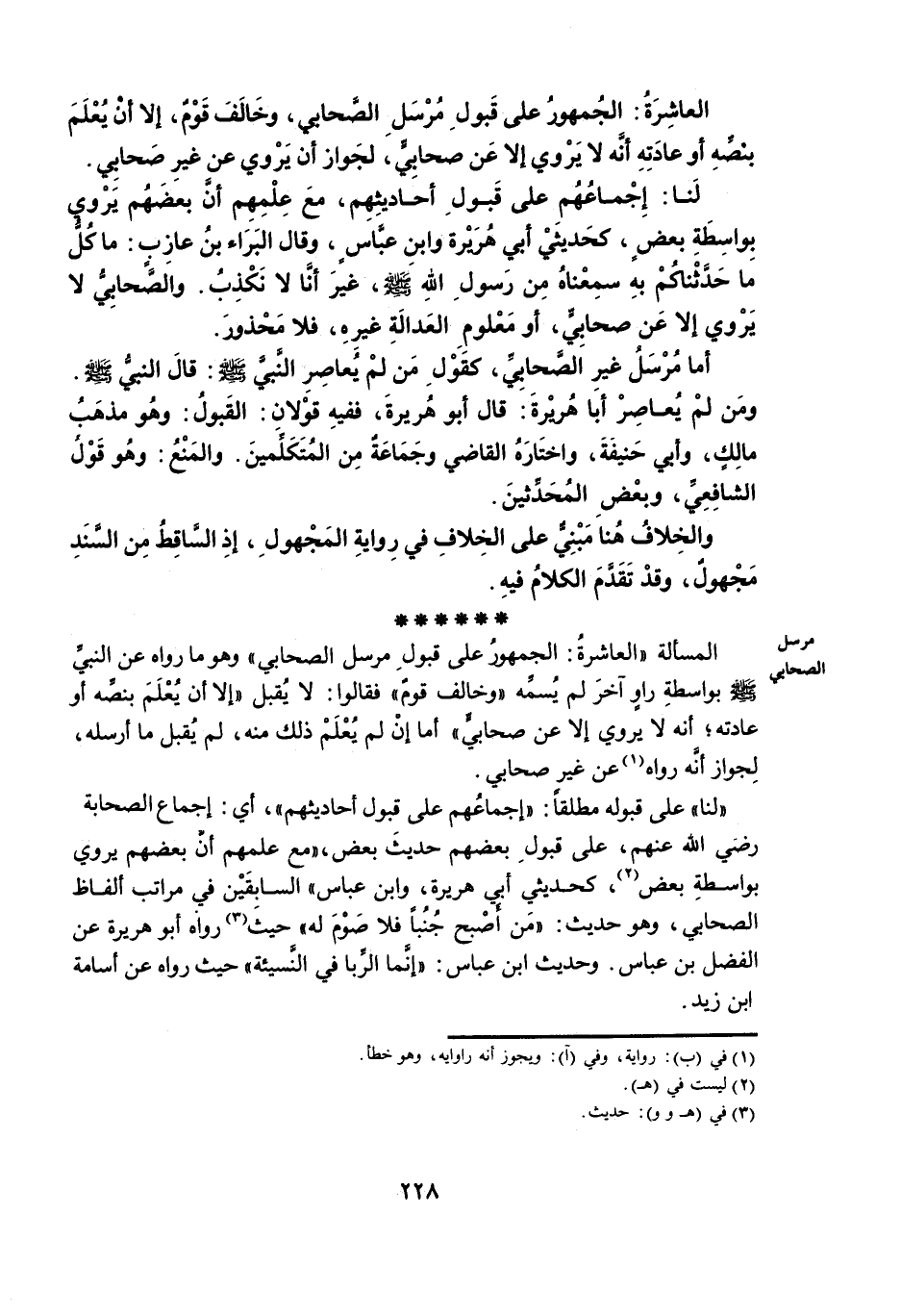 الْمَسْأَلَةُ «الْعَاشِرَةُ: الْجُمْهُورُ عَلَى قَبُولِ مُرْسَلِ الصَّحَابِيِّ» ، وَهُوَ مَا رَوَاهُ عَنِ النَّبِيِّ صَلَّى اللَّهُ عَلَيْهِ وَسَلَّمَ، بِوَاسِطَةِ رَاوٍ آخَرَ لَمْ يُسَمِّهِ، «وَخَالَفَ قَوْمٌ» ; فَقَالُوا: لَا يُقْبَلُ «إِلَّا أَنْ يُعْلَمَ بِنَصِّهِ أَوْ عَادَتِهِ، أَنَّهُ لَا يَرْوِي إِلَّا عَنِ صَحَابِيٍّ» ، أَمَّا إِنْ لَمْ يُعْلَمْ ذَلِكَ مِنْهُ، لَمْ يُقْبَلْ مَا أَرْسَلَهُ، لِجَوَازِ أَنَّهُ رَوَاهُ عَنْ غَيْرِ صَحَابِيٍّ.