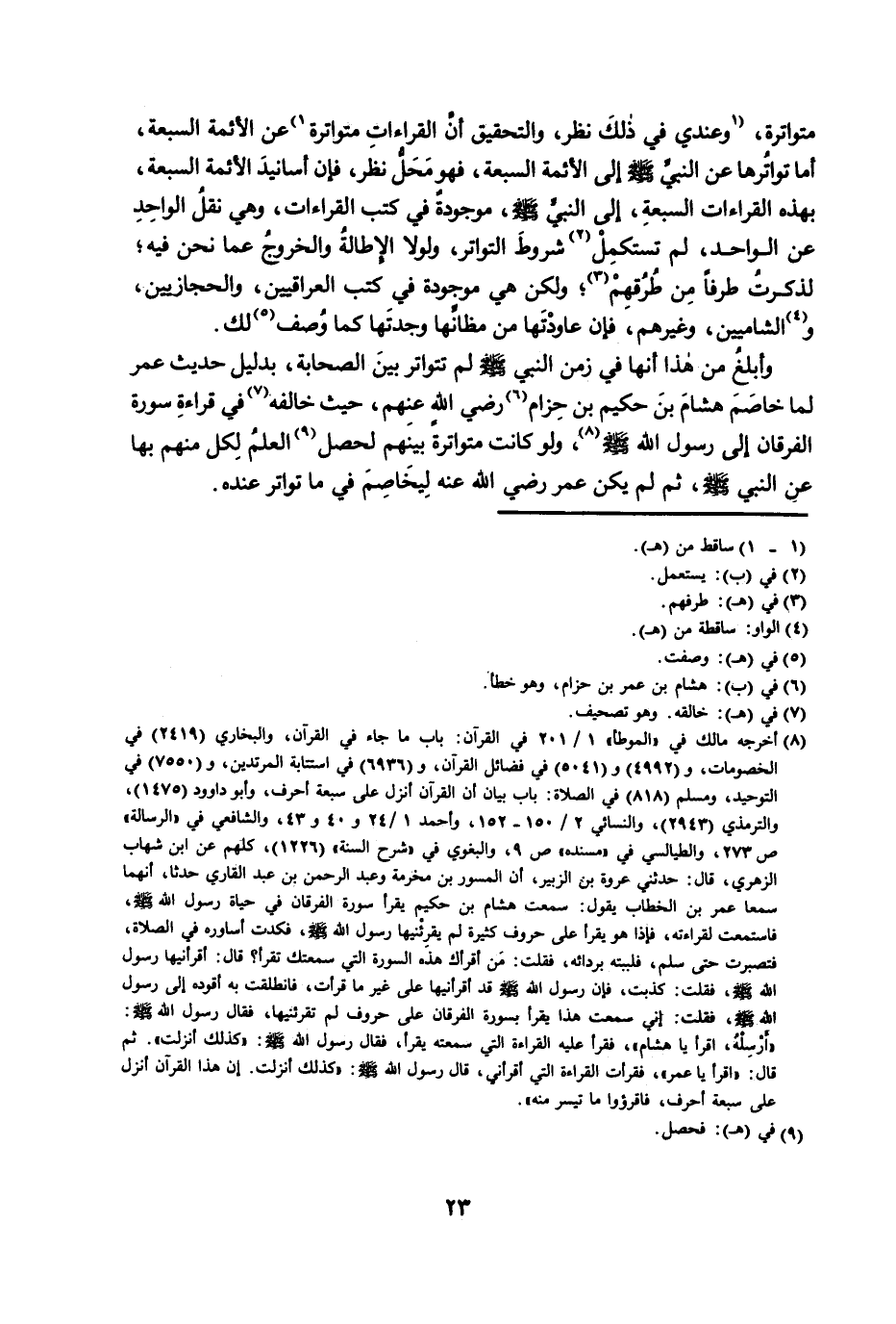 وَأَبْلَغُ مِنْ هَذَا أَنَّهَا فِي زَمَنِ النَّبِيِّ - صَلَّى اللَّهُ عَلَيْهِ وَسَلَّمَ - لَمْ تَتَوَاتَرْ بَيْنَ الصَّحَابَةِ، بِدَلِيلِ حَدِيثِ عُمَرَ لَمَّا خَاصَمَ هِشَامَ بْنَ حَكِيمِ بْنِ حِزَامٍ رَضِيَ اللَّهُ عَنْهُمْ، حَيْثُ خَالَفَهُ فِي قِرَاءَةِ سُورَةِ الْفُرْقَانِ إِلَى رَسُولِ اللَّهِ - صَلَّى اللَّهُ عَلَيْهِ وَسَلَّمَ - وَلَوْ كَانَتْ مُتَوَاتِرَةً بَيْنَهُمْ لَحَصَلَ الْعِلْمُ لِكُلٍّ مِنْهُمْ بِهَا عَنِ النَّبِيِّ - صَلَّى اللَّهُ عَلَيْهِ وَسَلَّمَ - ثُمَّ لَمْ يَكُنْ عُمَرُ رَضِيَ اللَّهُ عَنْهُ لِيُخَاصِمَ فِي مَا تَوَاتَرَ عِنْدَهُ.
