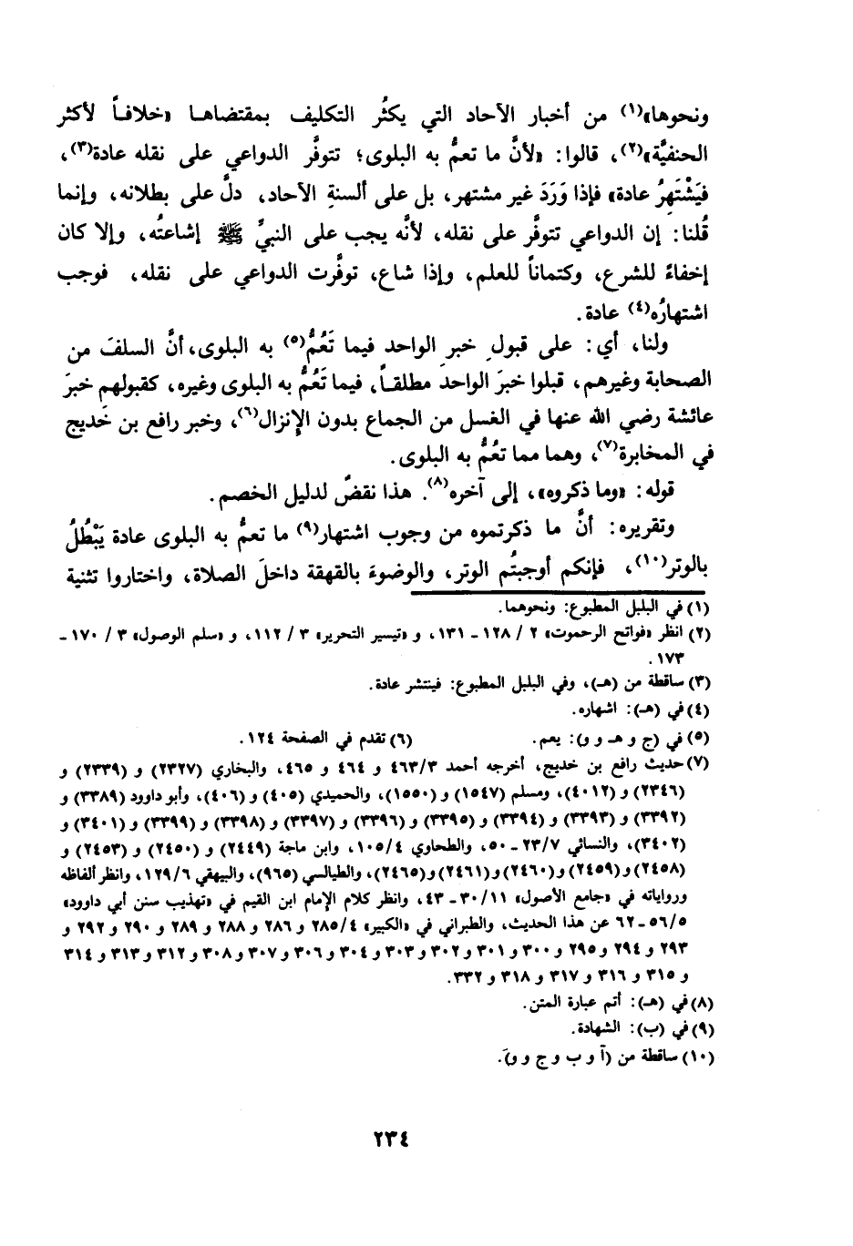 وَنَحْوِهَا» مِنْ أَخْبَارِ الْآحَادِ الَّتِي يَكْثُرُ التَّكْلِيفُ بِمُقْتَضَاهَا «خِلَافًا لِأَكْثَرِ الْحَنَفِيَّةِ» ، قَالُوا: «لِأَنَّ مَا تَعُمُّ بِهِ الْبَلْوَى ; تَتَوَفَّرُ الدَّوَاعِي عَلَى نَقْلِهِ عَادَةً ; فَيَشْتَهِرُ عَادَةً» فَإِذَا وَرَدَ غَيْرَ مُشْتَهِرٍ، بَلْ عَلَى أَلْسِنَةِ الْآحَادِ، دَلَّ عَلَى بُطْلَانِهِ، وَإِنَّمَا قُلْنَا: إِنَّ الدَّوَاعِيَ تَتَوَفَّرُ عَلَى نَقْلِهِ ; لِأَنَّهُ يَجِبُ عَلَى النَّبِيِّ صَلَّى اللَّهُ عَلَيْهِ وَسَلَّمَ، إِشَاعَتُهُ، وَإِلَّا كَانَ إِخْفَاءً لِلشَّرْعِ، وَكِتْمَانًا لِلْعِلْمِ، وَإِذَا شَاعَ، تَوَفَّرَتِ الدَّوَاعِي عَلَى نَقْلِهِ ; فَوَجَبَ اشْتِهَارُهُ عَادَةً.