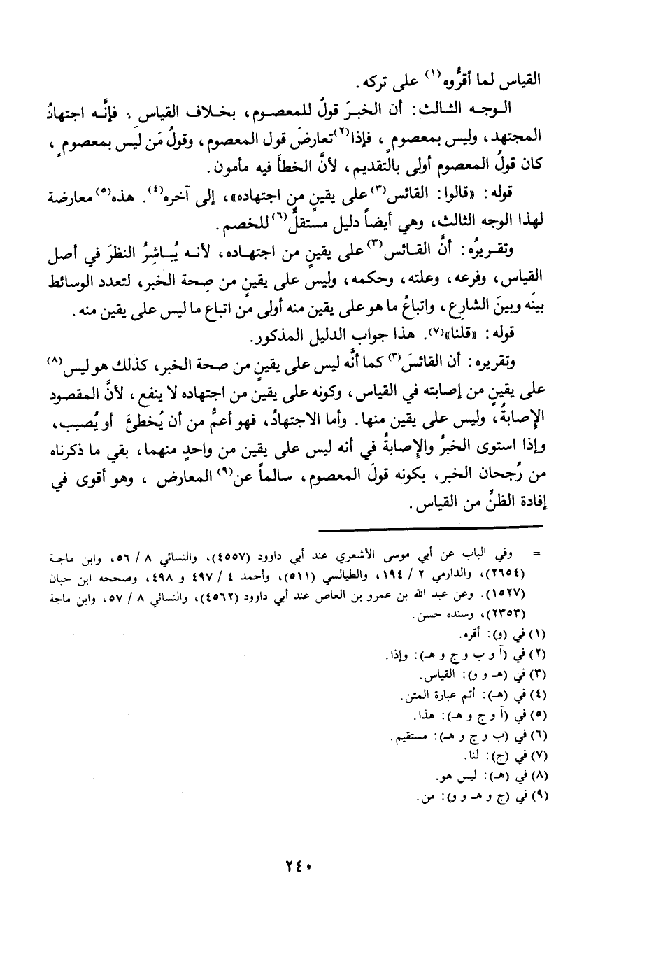وَتَقْرِيرُهُ: أَنَّ الْقَائِسَ كَمَا أَنَّهُ لَيْسَ عَلَى يَقِينٍ مِنْ صِحَّةِ الْخَبَرِ، كَذَلِكَ هُوَ لَيْسَ عَلَى يَقِينٍ مِنْ إِصَابَتِهِ فِي الْقِيَاسِ، وَكَوْنُهُ عَلَى يَقِينٍ مِنِ اجْتِهَادِهِ لَا يَنْفَعُ ; لِأَنَّ الْمَقْصُودَ الْإِصَابَةُ، وَلَيْسَ عَلَى يَقِينٍ مِنْهَا. وَأَمَّا الِاجْتِهَادُ ; فَهُوَ أَعَمُّ مِنْ أَنْ يُخْطِئَ أَوْ يُصِيبَ، وَإِذَا اسْتَوَى الْخَبَرُ وَالْإِصَابَةُ فِي أَنَّهُ لَيْسَ عَلَى يَقِينٍ مِنْ وَاحِدٍ مِنْهُمَا، بَقِيَ مَا ذَكَرْنَاهُ مِنْ رُجْحَانِ الْخَبَرِ، بِكَوْنِهِ قَوْلَ الْمَعْصُومِ، سَالِمًا عَنِ الْمُعَارِضِ، وَهُوَ أَقْوَى فِي إِفَادَةِ الظَّنِّ مِنَ الْقِيَاسِ.