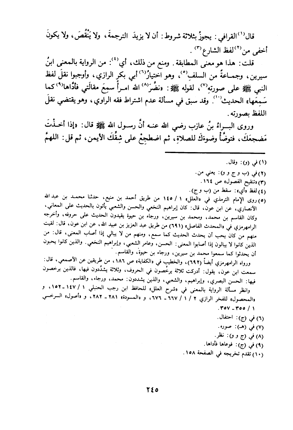 قَالَ الْقَرَافِيُّ: يَجُوزُ بِثَلَاثَةِ شُرُوطٍ: أَنْ لَا يَزِيدَ التَّرْجَمَةَ، وَلَا يَنْقُصَ، وَلَا يَكُونَ أَخْفَى مِنْ لَفْظِ الشَّارِعِ.