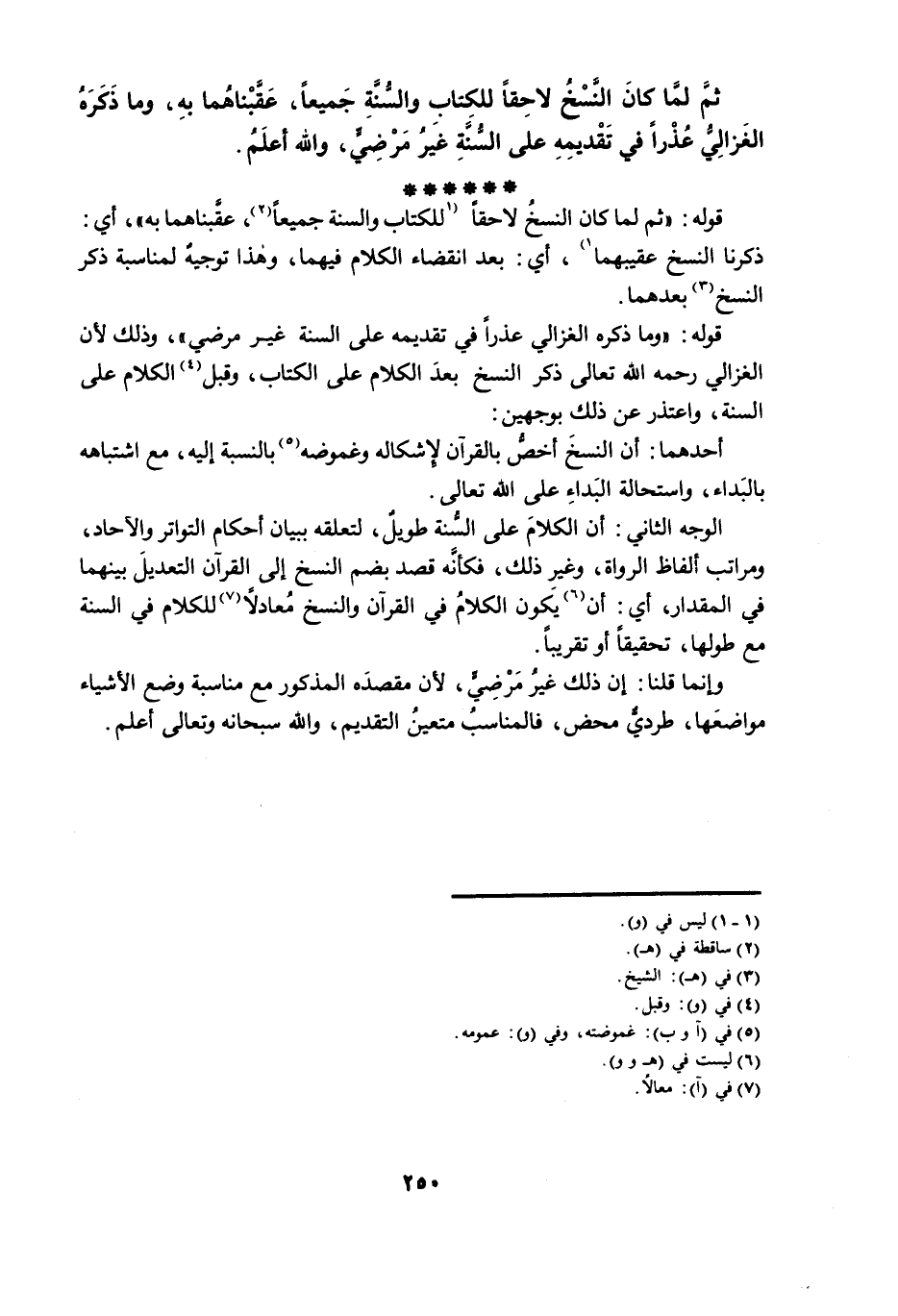 قَوْلُهُ: «وَمَا ذَكَرَهُ الْغَزَالِيُّ عُذْرًا فِي تَقْدِيمِهِ عَلَى السُّنَّةِ غَيْرُ مَرْضِيٍّ» ، وَذَلِكَ لِأَنَّ الْغَزَالِيَّ رَحِمَهُ اللَّهُ تَعَالَى ذَكَرَ النَّسْخَ بَعْدَ الْكَلَامِ عَلَى الْكِتَابِ، وَقَبْلَ الْكَلَامِ عَلَى السُّنَّةِ، وَاعْتَذَرَ عَنْ ذَلِكَ بِوَجْهَيْنِ: