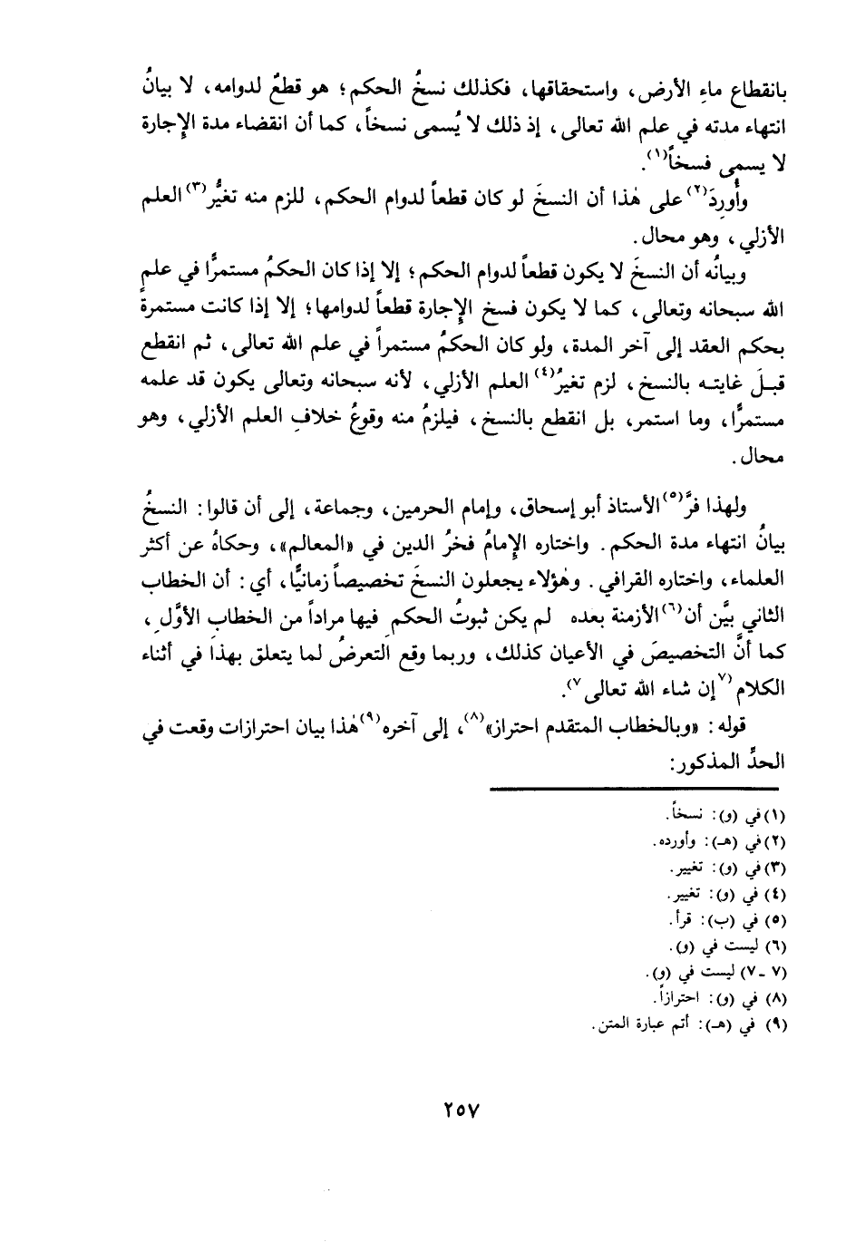 بِانْقِطَاعِ مَاءِ الْأَرْضِ، وَاسْتِحْقَاقِهَا ; فَكَذَلِكَ نَسْخُ الْحُكْمِ، هُوَ قَطْعٌ لِدَوَامِهِ، لَا بَيَانُ انْتِهَاءِ مُدَّتِهِ فِي عِلْمِ اللَّهِ تَعَالَى، إِذْ ذَلِكَ لَا يُسَمَّى نَسْخًا، كَمَا أَنَّ انْقِضَاءَ مُدَّةِ الْإِجَارَةِ لَا يُسَمَّى فَسْخًا.