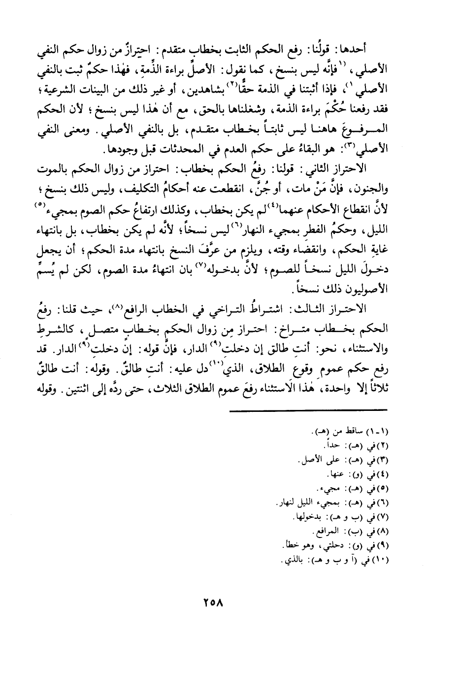 أَحَدُهَا: قَوْلُنَا: رَفْعُ الْحُكْمِ الثَّابِتِ بِخِطَابٍ مُتَقَدِّمٍ: احْتِرَازٌ مِنْ زَوَالِ حُكْمِ النَّفْيِ الْأَصْلِيِّ ; فَإِنَّهُ لَيْسَ بِنَسْخٍ، كَمَا نَقُولُ: الْأَصْلُ بَرَاءَةُ الذِّمَّةِ ; فَهَذَا حُكْمٌ ثَبَتَ بِالنَّفْيِ الْأَصْلِيِّ، فَإِذَا أَثْبَتْنَا فِي الذِّمَّةِ حَقًا بِشَاهِدَيْنِ، أَوْ غَيْرِ ذَلِكَ مِنَ الْبَيِّنَاتِ الشَّرْعِيَّةِ ; فَقَدْ رَفَعْنَا حُكْمَ بَرَاءَةِ الذِّمَّةِ، وَشَغَلْنَاهَا بِالْحَقِّ، مَعَ أَنَّ هَذَا لَيْسَ بِنَسْخٍ ; لِأَنَّ الْحُكْمَ الْمَرْفُوعَ هَاهُنَا لَيْسَ ثَابِتًا بِخِطَابٍ مُتَقَدِّمٍ، بَلْ بِالنَّفْيِ الْأَصْلِيِّ. وَمَعْنَى النَّفْيِ الْأَصْلِيِّ: هُوَ الْبَقَاءُ عَلَى حُكْمِ الْعَدَمِ فِي الْمُحْدَثَاتِ قَبْلَ وُجُودِهَا.