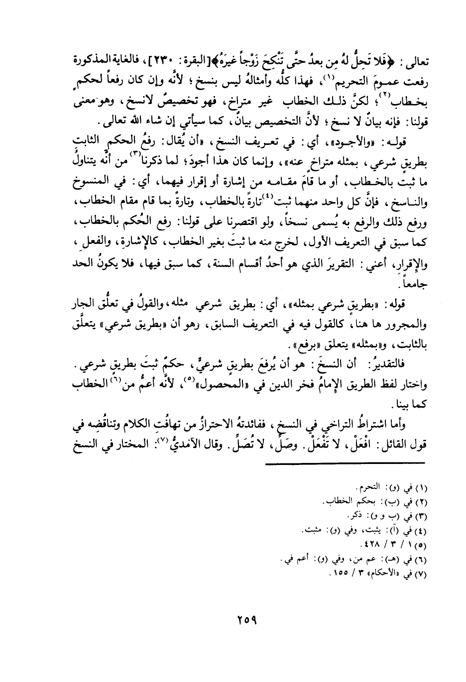 تَعَالَى: {فَلَا تَحِلُّ لَهُ مِنْ بَعْدُ حَتَّى تَنْكِحَ زَوْجًا غَيْرَهُ} [الْبَقَرَةِ: 230] ; فَالْغَايَةُ الْمَذْكُورَةُ رَفَعَتْ عُمُومَ التَّحْرِيمِ ; فَهَذَا كُلُّهُ وَأَمْثَالُهُ لَيْسَ بِنَسْخٍ ; لِأَنَّهُ وَإِنْ كَانَ رَفْعًا لِحُكْمٍ بِخِطَابٍ، لَكِنَّ ذَلِكَ الْخِطَابَ غَيْرُ مُتَرَاخٍ ; فَهُوَ تَخْصِيصٌ لَا نَسْخٌ، وَهُوَ مَعْنَى قَوْلِنَا: فَإِنَّهُ بَيَانٌ لَا نَسْخٌ ; لِأَنَّ التَّخْصِيصَ بَيَانٌ، كَمَا سَيَأْتِي إِنْ شَاءَ اللَّهُ تَعَالَى.