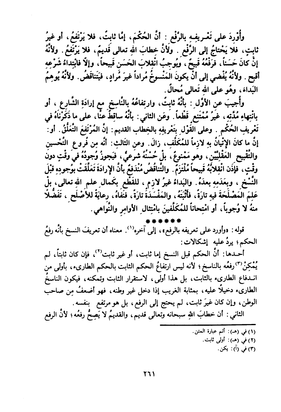 وَأُجِيبَ عَنِ الْأَوَّلِ: بِأَنَّهُ ثَابِتٌ، وَارْتِفَاعُهُ بِالنَّاسِخِ مَعَ إِرَادَةِ الشَّارِعِ، أَوْ بِانْتِهَاءِ مُدَّتِهِ، غَيْرُ مُمْتَنِعٍ قَطْعًا. وَعَنِ الثَّانِي: بِأَنَّهُ سَاقِطٌ عَنَّا، عَلَى مَا ذَكَرْنَاهُ فِي تَعْرِيفِ الْحُكْمِ. وَعَلَى الْقَوْلِ بِتَعْرِيفِهِ بِالْخِطَابِ الْقَدِيمِ: إِنَّ الْمُرْتَفِعَ التَّعَلُّقُ. أَوْ: إِنَّ مَا كَانَ الْإِتْيَانُ بِهِ لَازِمًا لِلْمُكَلَّفِ، زَالَ. وَعَنِ الثَّالِثِ: أَنَّهُ مِنْ فُرُوعِ التَّحْسِينِ وَالتَّقْبِيحِ الْعَقْلِيَّيْنِ، وَهُوَ مَمْنُوعٌ، بَلْ حُسْنُهُ شَرْعِيٌّ ; فَيَجُوزُ وَجُودُهُ فِي وَقْتٍ دُونَ وَقْتٍ ; فَإِذَنِ انْقِلَابُهُ قَبِيحًا مُلْتَزَمٌ. وَالتَّنَاقُضُ مُنْدَفِعٌ بِأَنَّ الْإِرَادَةَ تَعَلَّقَتْ بِوُجُودِهِ قَبْلَ النَّسْخِ، وَبِعَدَمِهِ بَعْدَهُ. وَالْبَدَاءُ غَيْرُ لَازِمٍ، لِلْقَطْعِ بِكَمَالِ عَلَمِ اللَّهِ تَعَالَى، بَلْ عَلِمَ الْمَصْلَحَةَ فِيهِ تَارَةً ; فَأَثْبَتَهُ، وَالْمَفْسَدَةَ تَارَةً ; فَنَفَاهُ، رِعَايَةً لِلْأَصْلَحِ، تَفَضُّلًا مِنْهُ لَا وُجُوبًا، أَوِ امْتِحَانًا لِلْمُكَلَّفِينَ بِامْتِثَالِ الْأَوَامِرِ وَالنَّوَاهِي.