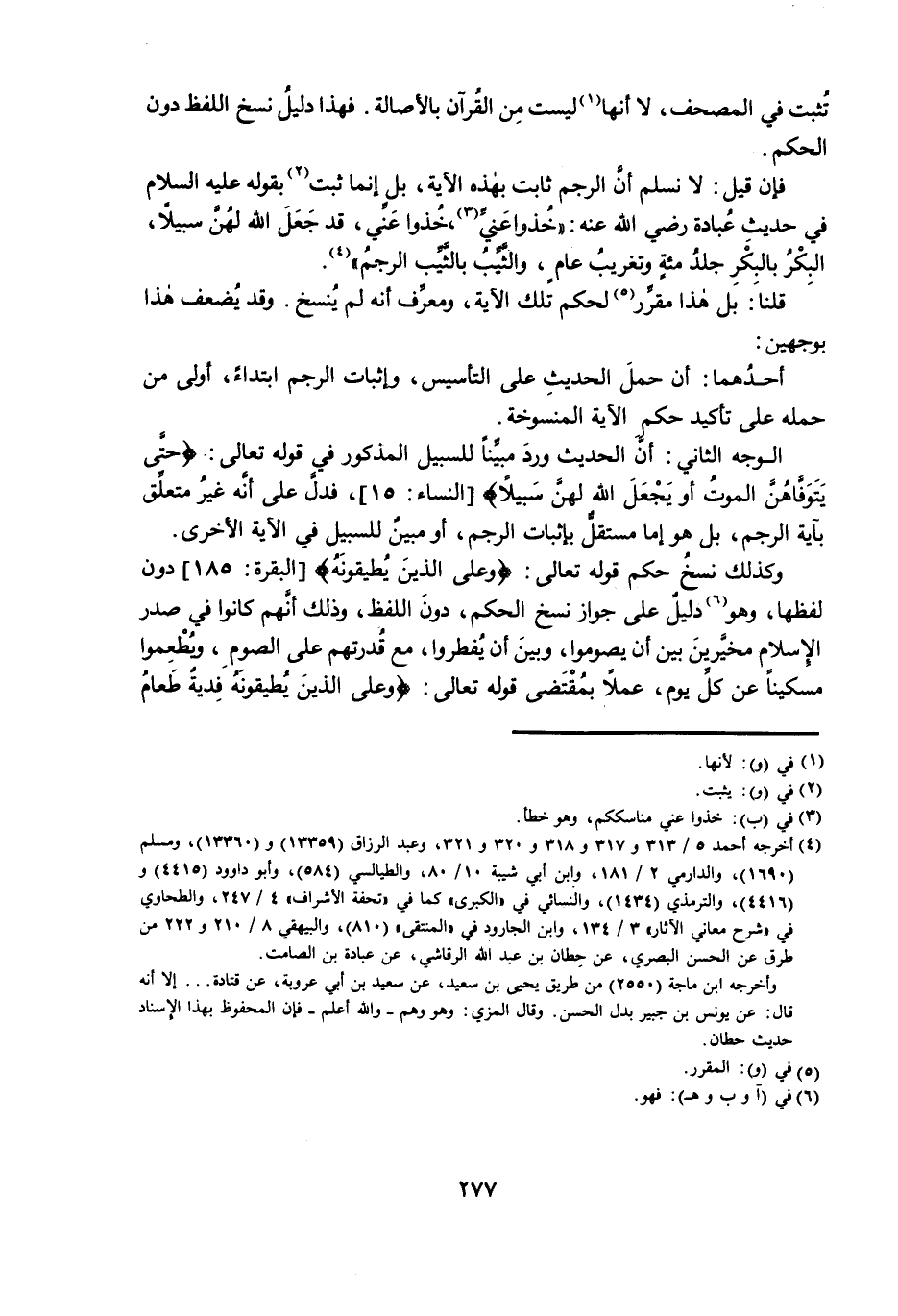 تُثْبَتَ فِي الْمُصْحَفِ، لَا أَنَّهَا لَيْسَتْ مِنَ الْقُرْآنِ بِالْأَصَالَةِ ; فَهَذَا دَلِيلُ نَسْخِ اللَّفْظِ دُونَ الْحُكْمِ.