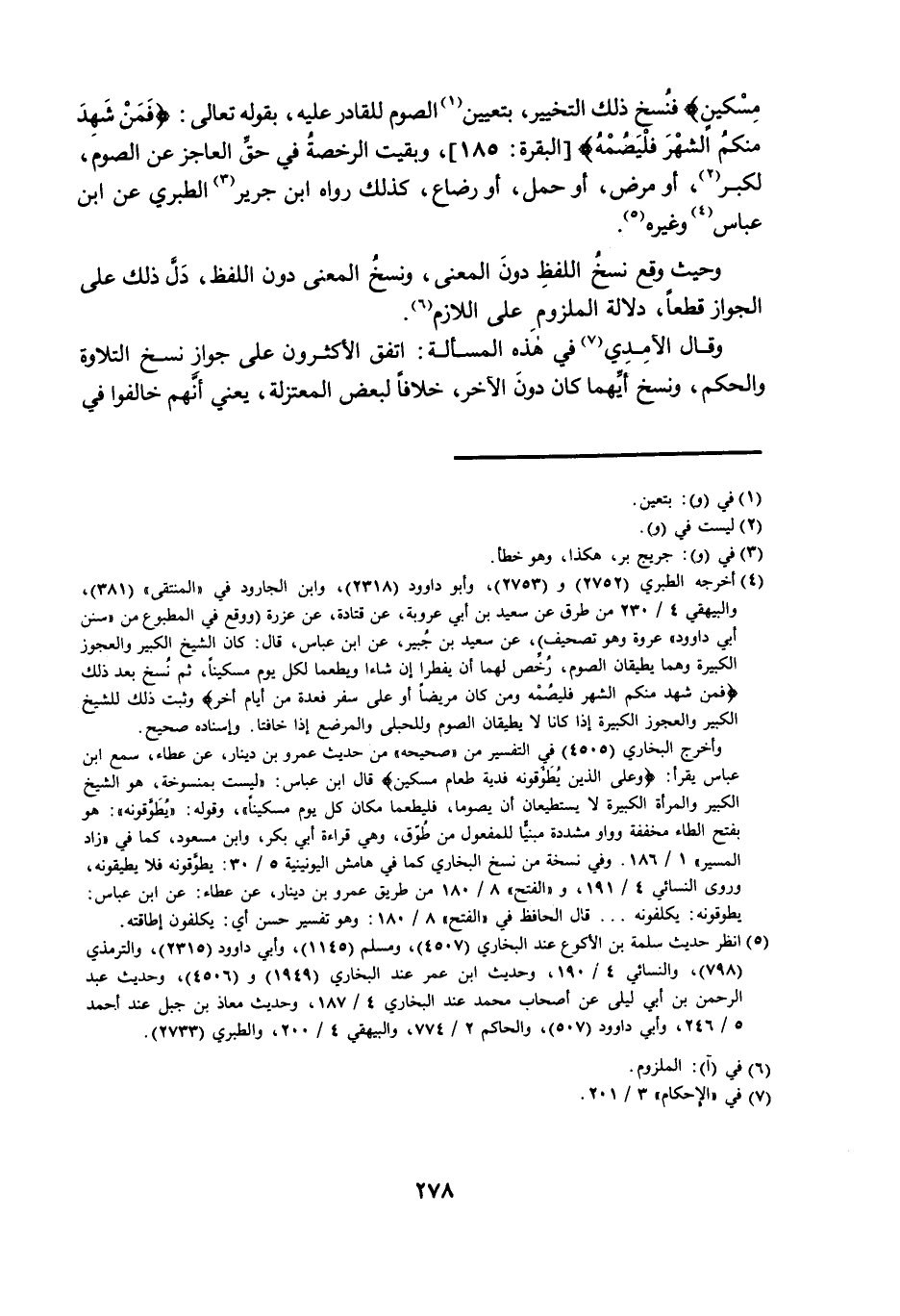 فَنُسِخَ ذَلِكَ التَّخْيِيرُ، بِتَعْيِينِ الصَّوْمِ لِلْقَادِرِ عَلَيْهِ، بِقَوْلِهِ تَعَالَى: {فَمَنْ شَهِدَ مِنْكُمُ الشَّهْرَ فَلْيَصُمْهُ} [الْبَقَرَةِ: 185] ، وَبَقِيَتِ الرُّخْصَةُ فِي حَقِّ الْعَاجِزِ عَنِ الصَّوْمِ، لِكِبَرٍ، أَوْ مَرِضٍ، أَوْ حَمْلٍ، أَوْ رَضَاعٍ، كَذَلِكَ رَوَاهُ ابْنُ جَرِيرٍ الطَّبَرِيُّ عَنِ ابْنِ عَبَّاسٍ وَغَيْرِهِ.