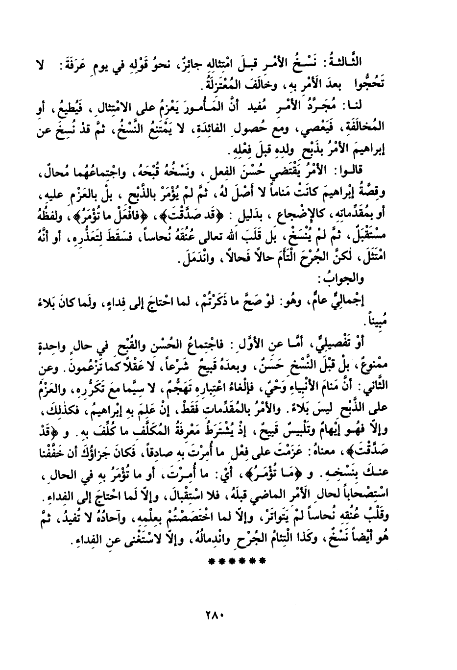 أَوْ تَفْصِيلِيٌّ، أَمَّا عَنِ الْأَوَّلِ: فَاجْتِمَاعُ الْحُسْنِ وَالْقُبْحِ فِي حَالٍ وَاحِدَةٍ مَمْنُوعٌ، بَلْ قَبْلَ النَّسْخِ حَسَنٌ، وَبَعْدَهُ قَبِيحٌ شَرْعًا، لَا عَقْلًا كَمَا تَزْعُمُونَ، وَعَنِ الثَّانِي: أَنَّ مَنَامَ الْأَنْبِيَاءِ وَحْيٌ ; فَإِلْغَاءُ اعْتِبَارِهِ تَهَجُّمٌ، لَا سِيَّمَا مَعَ تَكَرُّرِهِ، وَالْعَزْمُ عَلَى الذَّبْحِ لَيْسَ بَلَاءً، وَالْأَمْرُ بِالْمُقْدِمَاتِ فَقَطْ، إِنْ عَلِمَ بِهِ إِبْرَاهِيمُ ; فَكَذَلِكَ، وَإِلَّا فَهُوَ إِيهَامٌ وَتَلْبِيسٌ قَبِيحٌ، إِذْ يُشْتَرَطُ مَعْرِفَةُ الْمُكَلَّفِ مَا كُلِّفَ بِهِ. وَقَدْ صَدَّقْتَ، مَعْنَاهُ: عَزَمْتَ عَلَى فِعْلِ مَا أُمِرْتَ بِهِ صَادِقًا ; فَكَانَ جَزَاؤُكَ أَنْ خَفَّفْنَا عَنْكَ بِنَسْخِهِ. وَ {مَا تُؤْمَرُ} ، أَيْ: مَا أُمِرْتَ، أَوْ مَا تُؤْمَرُ بِهِ فِي الْحَالِ، اسْتِصْحَابًا لِحَالِ الْأَمْرِ الْمَاضِي قَبْلَهُ ; فَلَا اسْتِقْبَالَ، وَإِلَّا لَمَا احْتَاجَ إِلَى الْفِدَاءِ. وَقَلْبُ عُنُقِهِ نُحَاسًا لَمْ يَتَوَاتَرْ، وَإِلَّا لَمَا اخْتَصَصْتُمْ بِعِلْمِهِ، وَآحَادُهُ لَا تُفِيدُ، ثُمَّ هُوَ أَيْضًا نَسْخٌ، وَكَذَا الْتِئَامُ الْجُرْحِ وَانْدِمَالُهُ، وَإِلَّا لَاسْتَغْنَى عَنِ الْفِدَاءِ.