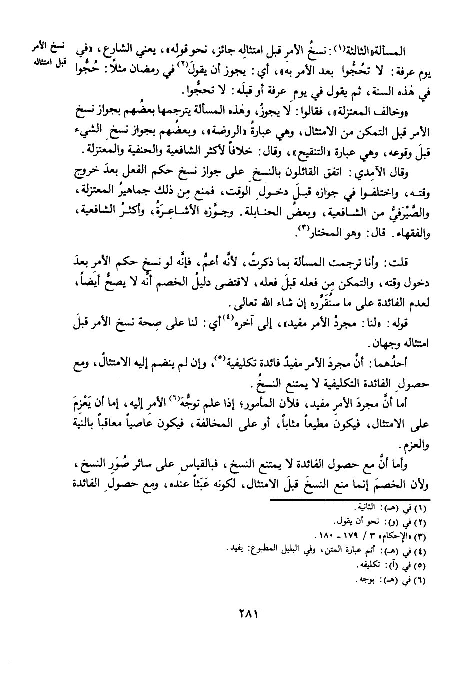الْمَسْأَلَةُ «الثَّالِثَةُ: نَسْخُ الْأَمْرِ قَبْلَ امْتِثَالِهِ جَائِزٌ، نَحْوَ قَوْلِهِ» ، يَعْنِي الشَّارِعَ، «فِي يَوْمِ عَرَفَةَ: لَا تَحُجُّوا بَعْدَ الْأَمْرِ بِهِ» ، أَيْ: يَجُوزُ أَنْ يَقُولَ فِي رَمَضَانَ مَثَلًا: حُجُّوا فِي هَذِهِ السَّنَةِ، ثُمَّ يَقُولُ فِي يَوْمِ عَرَفَةَ أَوْ قَبْلَهُ: لَا تَحُجُّوا.
